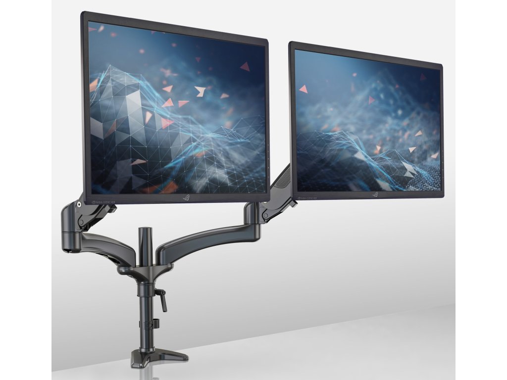 Uchwyt na 2 monitory. Odpowiedni do monitorów o rozmiarze do 32". Solidna aluminiowa konstrukcja z wbudowaną sprężyną gazową. Nośność każdego ramienia do 8 kg. Płyty mocujące są przeznaczone do rozmiarów VESA 75/75 i 100/100. Uchwyt mocuje się do blatu stołu za pomocą zacisku o zakresie mocowania grubości blatu do 85 mm. Szybka instalacja. Regulacja wysokości środkowego uchwytu do 200 mm. Zewnętrzne ramiona można regulować na wysokość do 350 mm. Każdą głowicę można płynnie przechylać i obracać w zależności od potrzeb. Zintegrowane umiejscowienie kabli gwarantuje czystą przestrzeń roboczą. Produkowany w kolorze czarnym.
