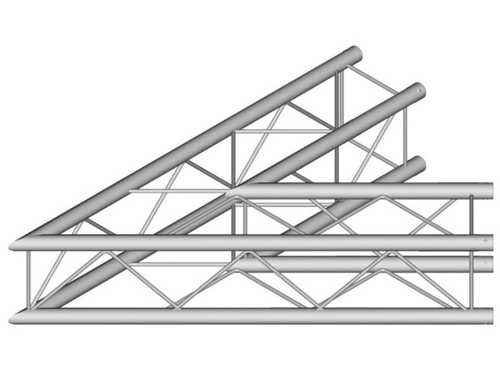 Narożny element konstrukcyjny umożliwiający budowę konstrukcji scenicznych do zawieszania instalacji oświetleniowych lub dźwiękowych. Element jest wygięty poziomo pod kątem 60 ° i wykonany z czterech prętów o średnicy 35 mm i grubości ścianki 2 mm. Konstrukcja wykonana jest ze stopu AlMgSi1, dzięki czemu każdy z elementów serii DT24 zachowuje niską wagę i wysoką odporność. Pręty wzmacniające mają średnicę 8 mm. Element jest wyposażony w końcówki do zasilania kolejnych elementów. W zestawie znajdują się również śruby i klamry zabezpieczające. Wymiary: 1000 x 1000 x 220 mm, waga: 4,6 kg.