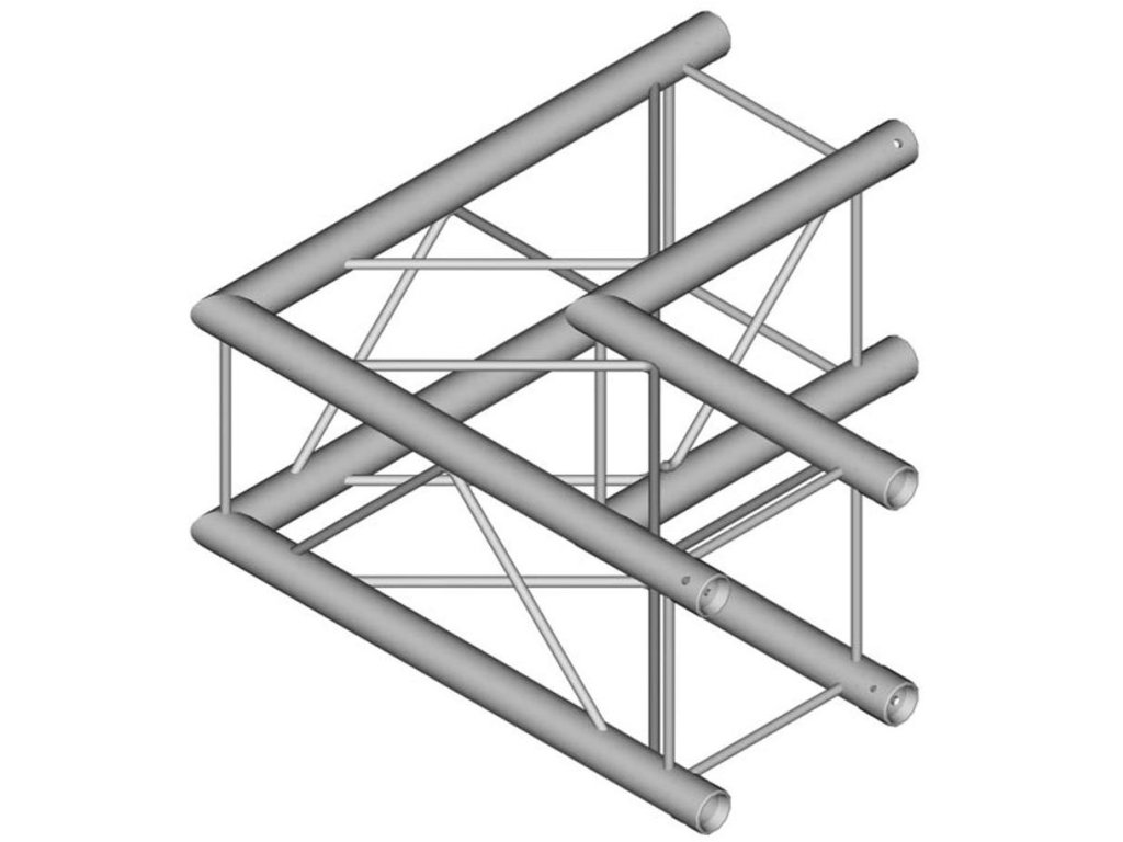 Narożny element konstrukcyjny umożliwiający budowę konstrukcji scenicznych do zawieszania instalacji oświetleniowych lub dźwiękowych. Element jest zagięty poziomo pod kątem 90° i wykonany z czterech prętów o średnicy 35 mm i grubości ścianek 2 mm. Konstrukcja wykonana jest ze stopu AlMgSi1, dzięki czemu każdy z elementów serii DT24 zachowuje niską wagę i wysoką odporność. Pręty wzmacniające mają średnicę 8 mm. Element jest wyposażony w końcówki do zasilania kolejnych elementów. W zestawie znajdują się również śruby i klamry zabezpieczające. Wymiary: 500 x 500 x 220 mm, waga: 2,7 kg.