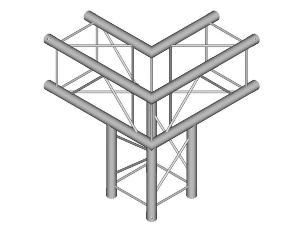 Narożny element konstrukcyjny umożliwiający budowę konstrukcji scenicznych do zawieszania instalacji oświetleniowych lub dźwiękowych. Element jest zagięty pod kątem 90 °, uzupełniony o skierowane w dół ramię pionowe i wykonany z czterech prętów o średnicy 35 mm i grubości ścianek 2 mm. Konstrukcja wykonana jest ze stopu AlMgSi1, dzięki czemu każdy z elementów serii DT24 zachowuje niską wagę i wysoką odporność. Pręty wzmacniające mają średnicę 8 mm. Element jest wyposażony w końcówki do zasilania kolejnych elementów. W zestawie znajdują się również śruby i klamry zabezpieczające. Wymiary: 500 x 500 x 500 mm, waga: 3,5 kg.