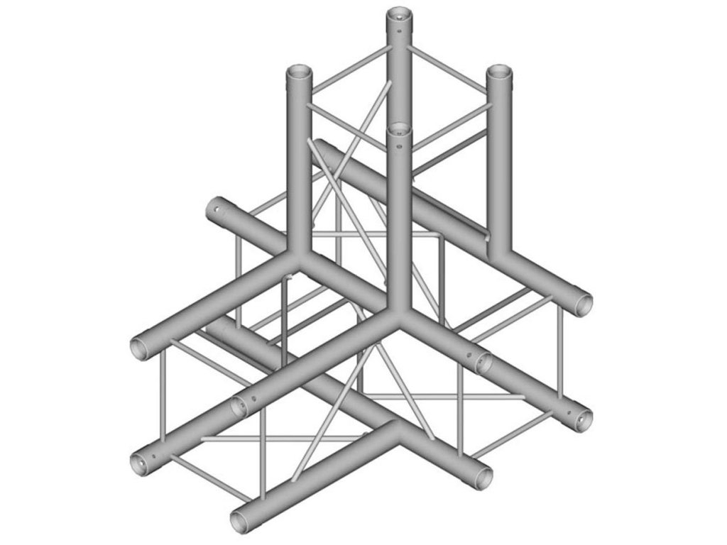 Narożny element konstrukcyjny umożliwiający budowę konstrukcji scenicznych do zawieszania instalacji oświetleniowych lub dźwiękowych. Element jest zagięty pod kątem 90 ° w kształcie litery T i wykonany jest z czterech prętów o średnicy 35 mm i grubości ścianek 2 mm. Konstrukcja wykonana jest ze stopu AlMgSi1, dzięki czemu każdy z elementów serii DT24 zachowuje niską wagę i wysoką odporność. Pręty wzmacniające mają średnicę 8 mm. Element jest wyposażony w końcówki do zasilania kolejnych elementów. W zestawie znajdują się również śruby i klamry zabezpieczające. Wymiary: 500 x 500 x 500 mm, waga: 3,7 kg.