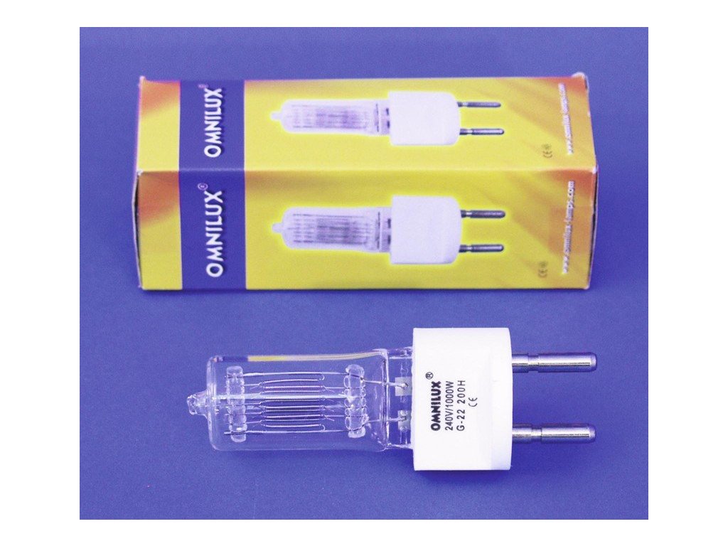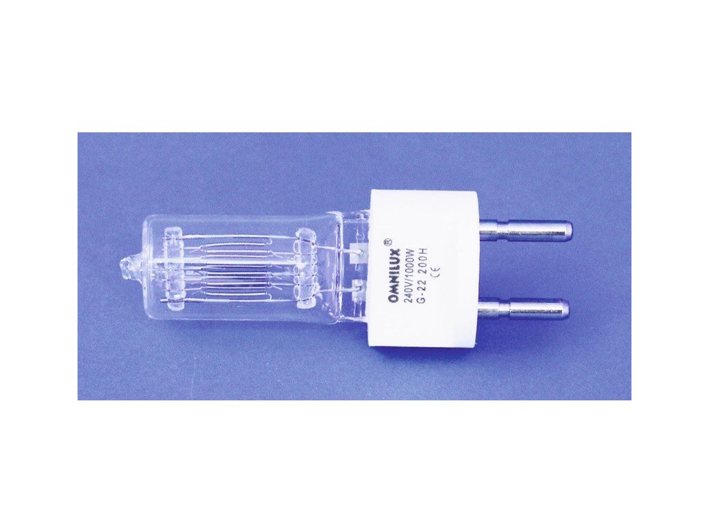 Lampa z reflektorem z trzonkiem G22, mocą 1000 W i żywotnością 200 godzin.