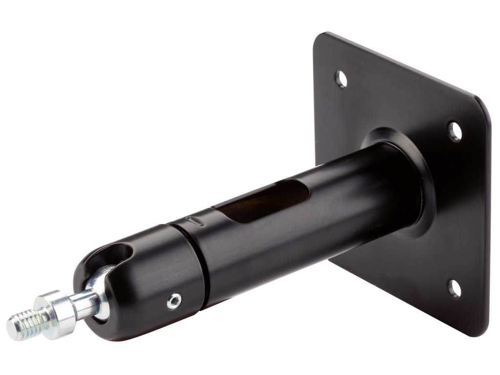 Stalowy uchwyt ścienny lub sufitowy ze złączem gwintowanym 3/8" odpowiedni do małych głośników. Wyjście kablowe do ukrytego wewnętrznego prowadzenia kabli. Precyzyjna regulacja przegubu za pomocą trzpienia gwintowanego. Kąt nachylenia 0° - 90°. Nośność uchwytu 10 kg. Odległość od ściany 160 mm. Bez płytki do mocowania głośnika.