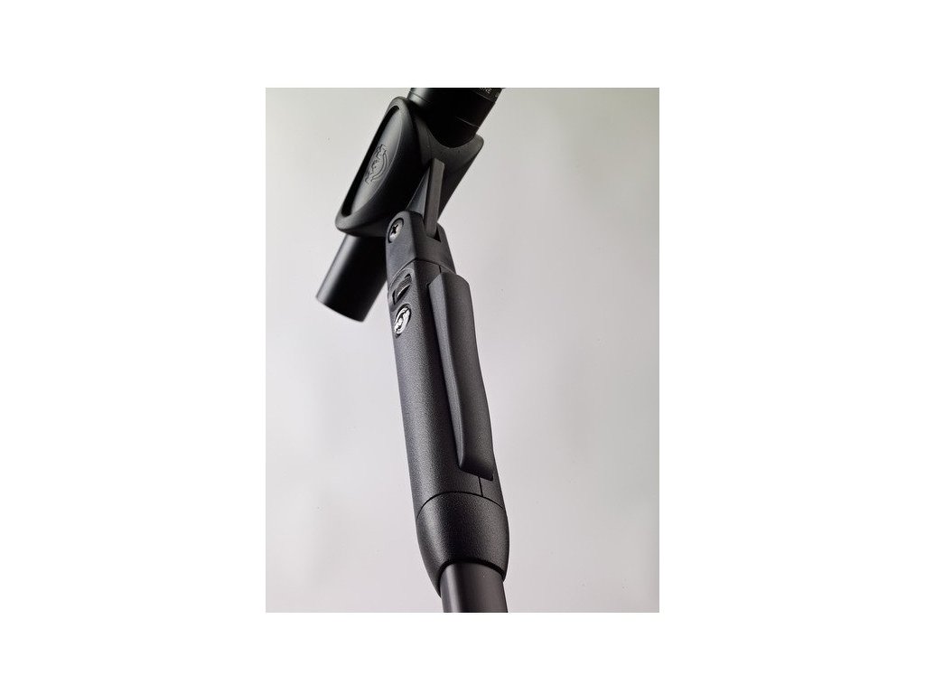 Mikrofonowy wysuwany, obsługiwany jedną ręką, antywibracyjny statyw solo z okrągłą podstawą. Wysokość statywu 1055 - 1735 mm. Aluminiowy drążek ma trójkątny kształt. Statyw jest wyraźnie lekki, ale mimo to stabilny dzięki okrągłej podstawie z włożoną stalową płytą. Podstawa o średnicy 275 mm ma antywibracyjną gumową wkładkę. Produkowany w kolorze czarnym.