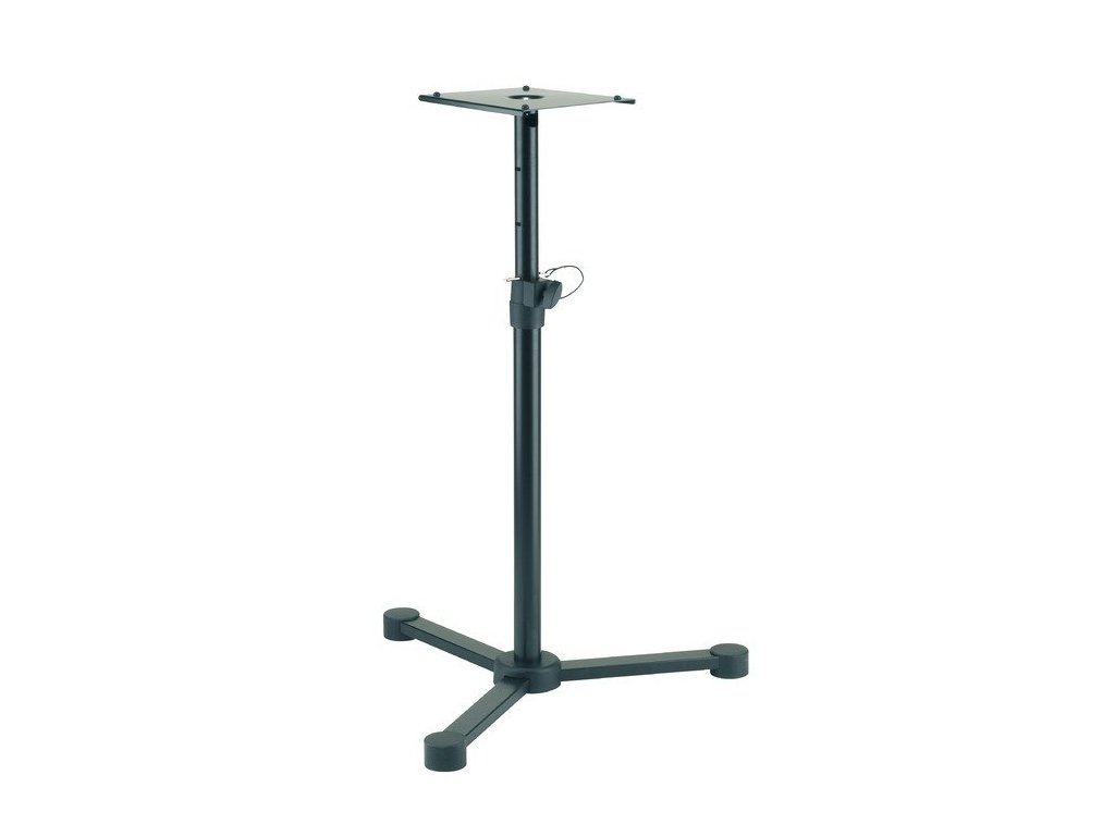 Stalowy stojak pod monitory studyjne z 3-nożną podstawą. Bardzo stabilna i solidna konstrukcja. Regulowana wysokość za pomocą śruby i dodatkowego zabezpieczenia przymocowanego na stalowej lince.