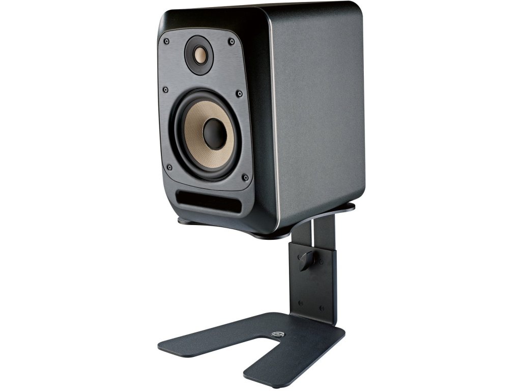 Stojak stołowy do monitorów studyjnych i głośników. Wymiary płyty nośnej 230 x 250 mm. Regulowana wysokość 167 - 254 mm. 4 gumowe podkładki zapewniają stabilność i filtrację szumów. Nośność 15 kg. Produkowany w kolorze czarnym strukturalnym.