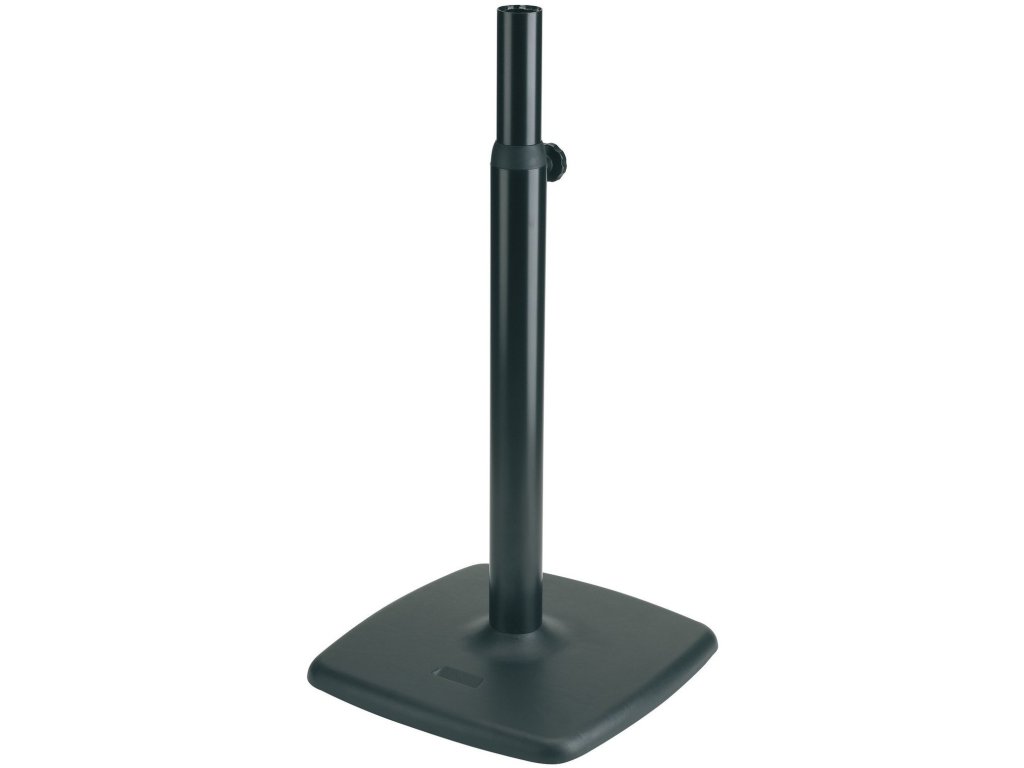 Stalowy, wysuwany statyw głośnikowy z żeliwną podstawą. Wysokość statywu 800 - 1350 mm, wymiary podstawy 480 x 480 mm. Stopniowa regulacja wysokości za pomocą śruby mocującej. Montaż głośnika odbywa się na trzech różnych typach płyt nośnych 26792. Produkowany w kolorze czarnym.