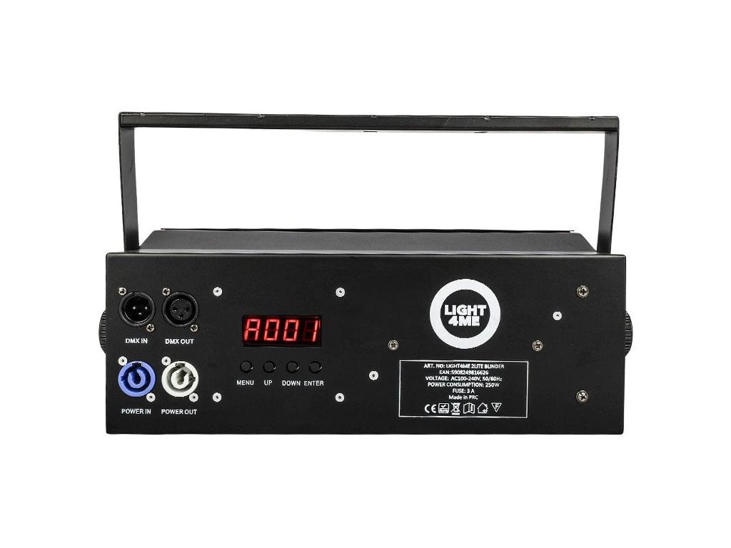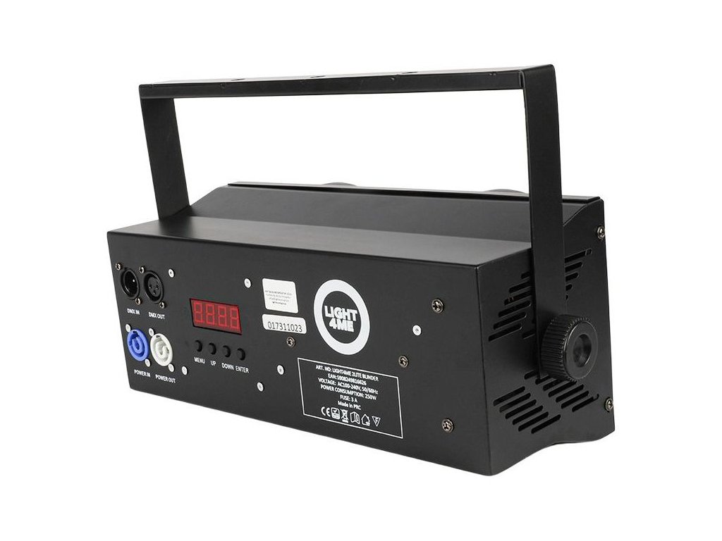 Light4Me 2Lite Blinder może stać lub być łatwo zainstalowany na konstrukcjach kratownicowych lub rampach oświetleniowych za pomocą uchwytu montażowego, który jest częścią jednostki. Ten montaż umożliwia ustawienie żądanego kąta oświetlenia i w rezultacie oświetlenie żądanej powierzchni. Z tyłu znajdują się złącza zasilania PowerCon, w tym specjalne wyjście "pass on" do bezpośredniego przesyłania napięcia między urządzeniami. Ponadto znajdują się tutaj również 3-pinowe złącza XLR, które umożliwiają sterowanie reflektorem za pomocą protokołu DMX. Panel sterowania składa się z cyfrowego wyświetlacza i czterech przycisków, co gwarantuje łatwą konfigurację i obsługę. Za jego pomocą możemy wybrać jeden z czterech trybów pracy: