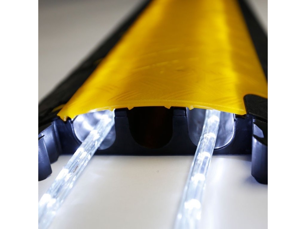 Doskonałe rozwiązanie do ochrony kabli i zapobiegania potykaniu się: Innowacyjne najazdy kablowe z serii Defender LUX mają wysoce przezroczyste, żółte osłony, w których można układać świetlówki LED równolegle do kabli i innych przewodów. Najazdy kablowe Defender LUX zostały opracowane we współpracy z organizatorami imprez i operatorami dużych hal i terenów festiwalowych przy użyciu najnowocześniejszych technologii i zapewniają najwyższe możliwe bezpieczeństwo i widoczność nawet w ciemności, zarówno wewnątrz, jak i na zewnątrz.
