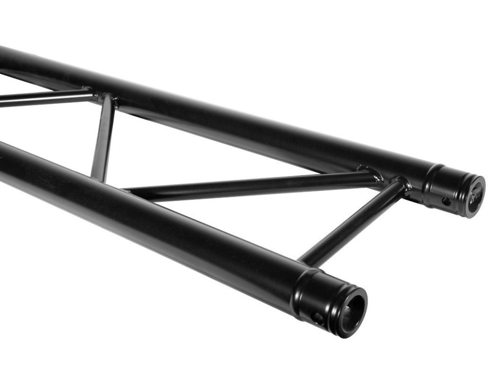 Prosty element konstrukcyjny do budowy słupów i podiów oraz do zawieszania instalacji oświetleniowych lub dźwiękowych. Element z serii DT 32-2 składa się z dwóch głównych rur o średnicy 50 mm i grubości ścianek 2 mm. Pręty podtrzymujące mają średnicę 20 mm i grubość ścianek 2 mm. Konstrukcja wykonana jest ze stopu AlMgSi1, dzięki czemu każdy z elementów serii DT 32-2 zachowuje niską wagę i wysoką wytrzymałość. Element jest wyposażony w końcówki do zasilania kolejnych elementów. Wymiary: 3000 x 290 x 50 mm, waga: 6,7 kg. Kolor czarny.