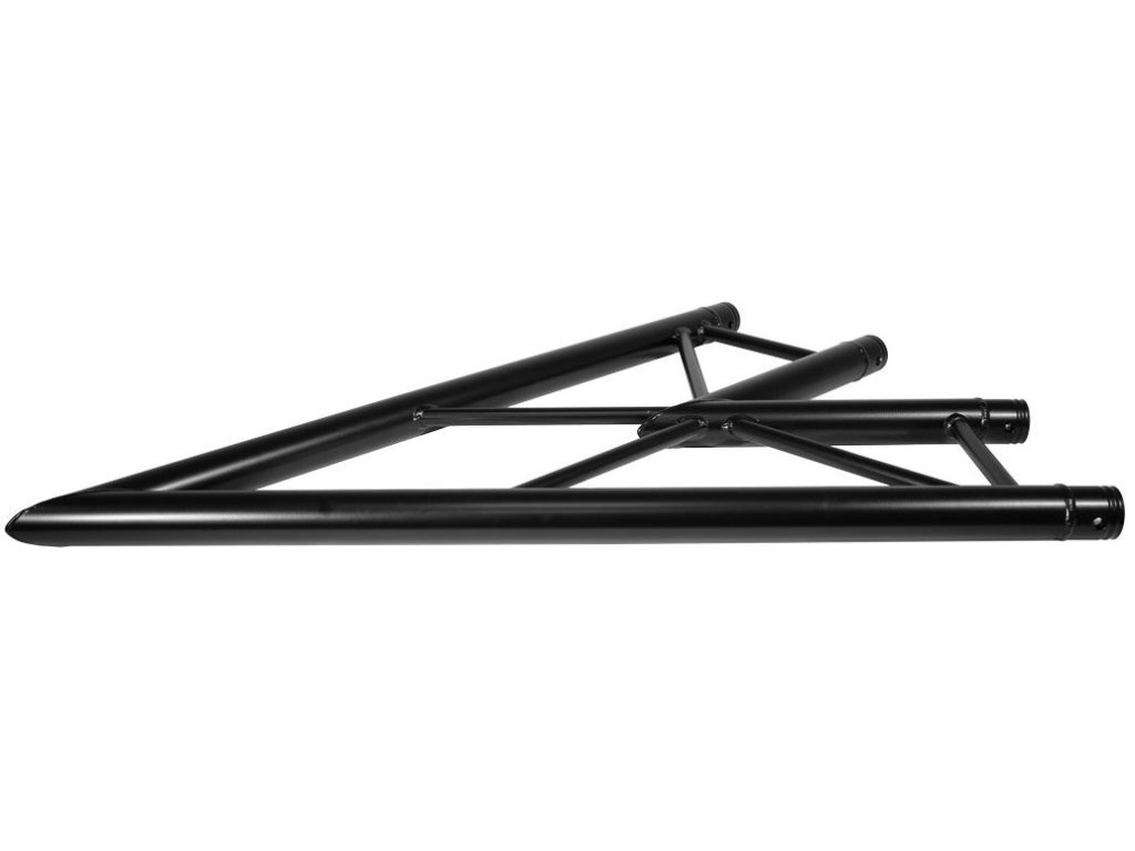 Narożny element konstrukcyjny do budowy słupów i podiów oraz do zawieszania instalacji oświetleniowych lub dźwiękowych. Element z serii DT 32-2 składa się z dwóch łączących się prętów o średnicy 50 mm i grubości ścianek 2 mm. Pręty podtrzymujące mają średnicę 20 mm i grubość ścianek 2 mm. Konstrukcja wykonana jest ze stopu AlMgSi1, dzięki czemu każdy z elementów serii DT 32-2 zachowuje niską wagę i wysoką wytrzymałość. Element jest wyposażony w końcówki do zasilania kolejnych elementów. Kąt nachylenia: 45° poziomo. Wymiary: 1000 x 1000 x 50 mm, waga: 3,3 kg. Kolor czarny.