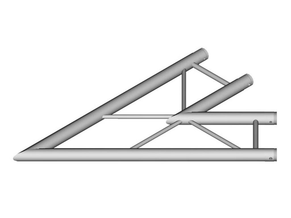 Narożny element konstrukcyjny do budowy słupów i podiów oraz do zawieszania instalacji oświetleniowych lub dźwiękowych. Element z serii DT 32-2 składa się z dwóch łączących się prętów o średnicy 50 mm i grubości ścianek 2 mm. Pręty podtrzymujące mają średnicę 20 mm i grubość ścianek 2 mm. Konstrukcja wykonana jest ze stopu AlMgSi1, dzięki czemu każdy z elementów serii DT 32-2 zachowuje niską wagę i wysoką wytrzymałość. Element jest wyposażony w końcówki do zasilania kolejnych elementów. Kąt nachylenia: 45° poziomo. Wymiary: 1000 x 1000 x 50 mm, waga: 3,3 kg.