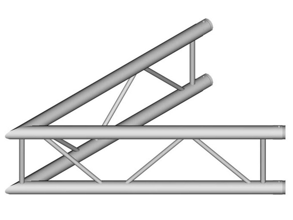 Narożny element konstrukcyjny do budowy słupów i podiów oraz do zawieszania instalacji oświetleniowych lub dźwiękowych. Element z serii DT 32-2 składa się z dwóch łączących się prętów o średnicy 50 mm i grubości ścianek 2 mm. Pręty podtrzymujące mają średnicę 20 mm i grubość ścianek 2 mm. Konstrukcja wykonana jest ze stopu AlMgSi1, dzięki czemu każdy z elementów serii DT 32-2 zachowuje niską wagę i wysoką wytrzymałość. Element jest wyposażony w końcówki do zasilania kolejnych elementów. Kąt nachylenia: 45° w pionie. Wymiary: 1000 x 1000 x 290 mm, waga: 3,5 kg.