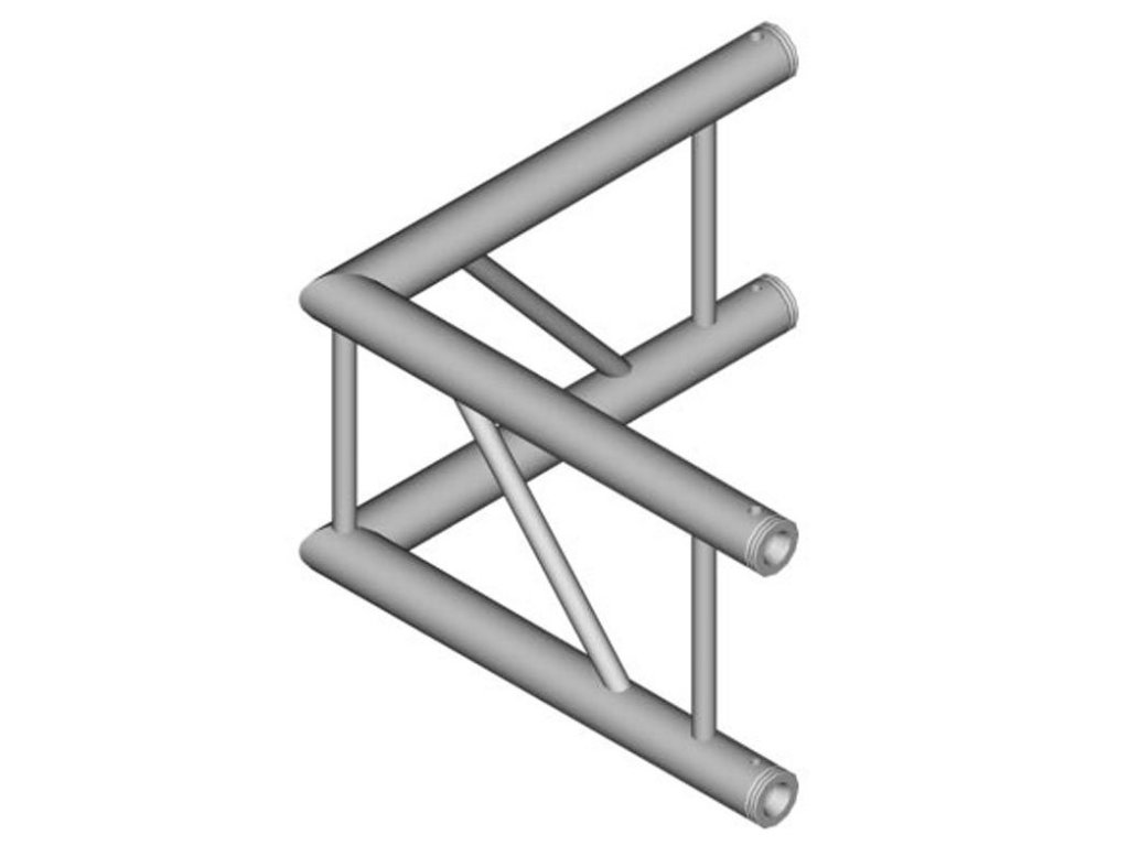 Narożny element konstrukcyjny do budowy słupów i podiów oraz do zawieszania instalacji oświetleniowych lub dźwiękowych. Element z serii DT 32-2 składa się z dwóch łączących się prętów o średnicy 50 mm i grubości ścianek 2 mm. Pręty podtrzymujące mają średnicę 20 mm i grubość ścianek 2 mm. Konstrukcja wykonana jest ze stopu AlMgSi1, dzięki czemu każdy z elementów serii DT 32-2 zachowuje niską wagę i wysoką wytrzymałość. Element jest wyposażony w końcówki do zasilania kolejnych elementów. Kąt nachylenia: 90° w pionie. Wymiary: 500 x 500 x 290 mm, waga: 2,5 kg.