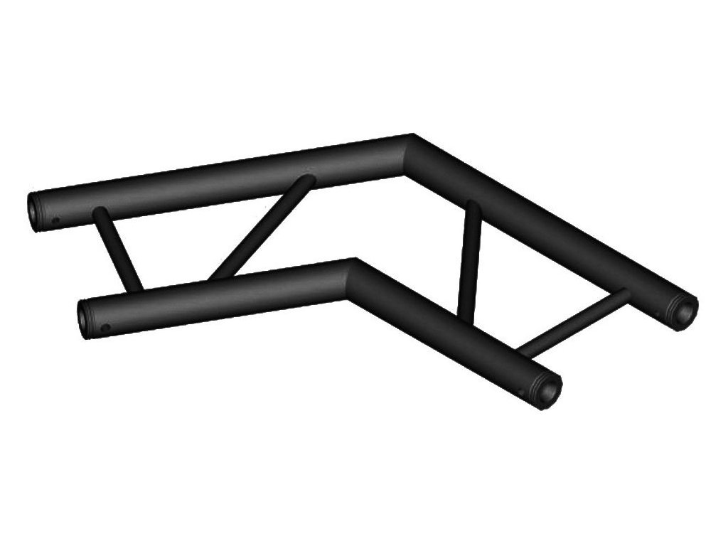 Narożny element konstrukcyjny do budowy słupów i podiów oraz do zawieszania instalacji oświetleniowych lub dźwiękowych. Element z serii DT 32-2 składa się z dwóch łączących się prętów o średnicy 50 mm i grubości ścianek 2 mm. Pręty podtrzymujące mają średnicę 20 mm i grubość ścianek 2 mm. Konstrukcja wykonana jest ze stopu AlMgSi1, dzięki czemu każdy z elementów serii DT 32-2 zachowuje niską wagę i wysoką wytrzymałość. Element jest wyposażony w końcówki do zasilania kolejnych elementów. Kąt nachylenia: 120° w poziomie. Wymiary: 500 x 500 x 50 mm, waga: 2,6 kg. Kolor czarny.