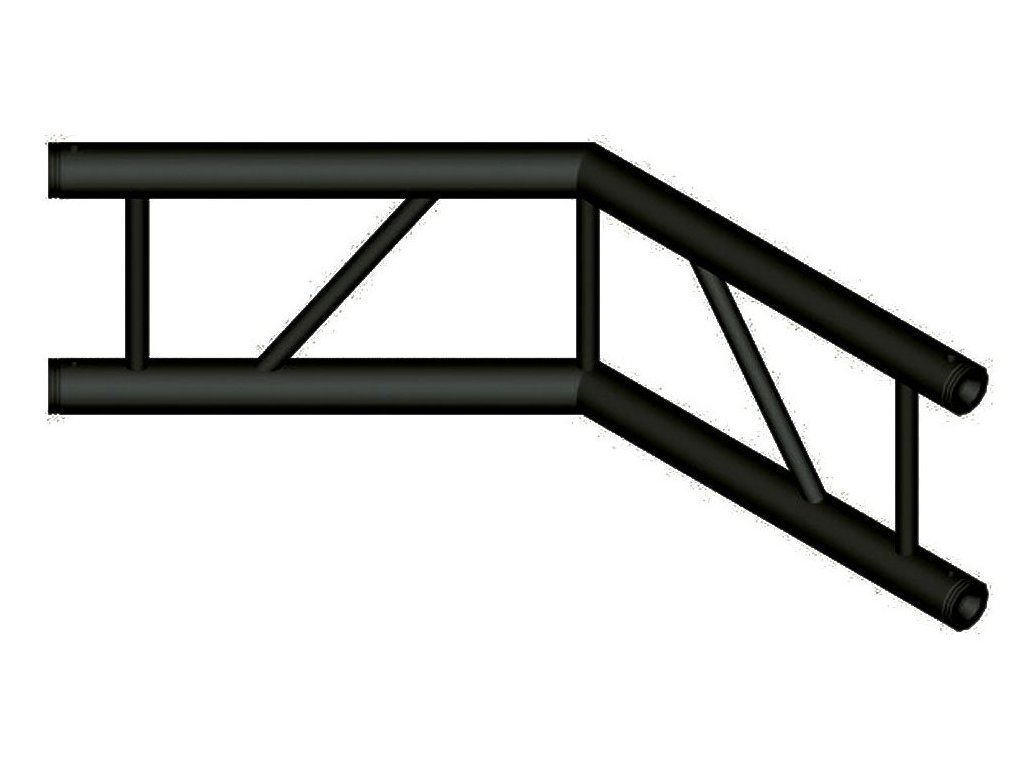 Narożny element konstrukcyjny do budowy słupów i podiów oraz do zawieszania instalacji oświetleniowych lub dźwiękowych. Element z serii DT 32-2 składa się z dwóch łączących się prętów o średnicy 50 mm i grubości ścianek 2 mm. Pręty podtrzymujące mają średnicę 20 mm i grubość ścianek 2 mm. Konstrukcja wykonana jest ze stopu AlMgSi1, dzięki czemu każdy z elementów serii DT 32-2 zachowuje niską wagę i wysoką wytrzymałość. Element jest wyposażony w końcówki do zasilania kolejnych elementów. Kąt nachylenia: 135° w pionie. Wymiary: 500 x 500 x 290 mm, waga: 2,7 kg. Kolor czarny.