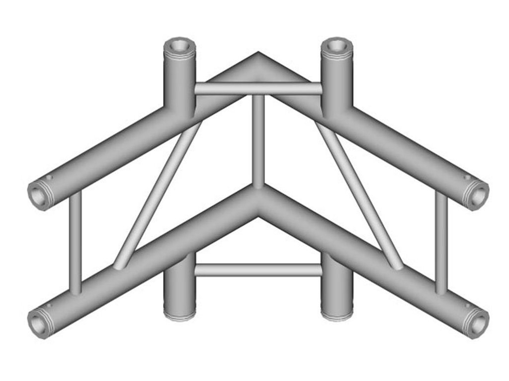 Narożny element konstrukcyjny do budowy słupów i podiów oraz do zawieszania instalacji oświetleniowych lub dźwiękowych. Element serii DT 32-2 składa się z dwóch łączących się prętów ustawionych w 4 kierunkach. Pręty mają średnicę 50 mm i grubość ścianek 2 mm. Pręty podtrzymujące mają średnicę 20 mm i grubość ścianek 2 mm. Konstrukcja wykonana jest ze stopu AlMgSi1, dzięki czemu każdy z elementów serii DT 32-2 zachowuje niską wagę i wysoką wytrzymałość. Element jest wyposażony w końcówki do zasilania kolejnych elementów. Kąt nachylenia: 90° w pionie. Wymiary: 500 x 500 x 500 mm, waga: 4,4 kg.