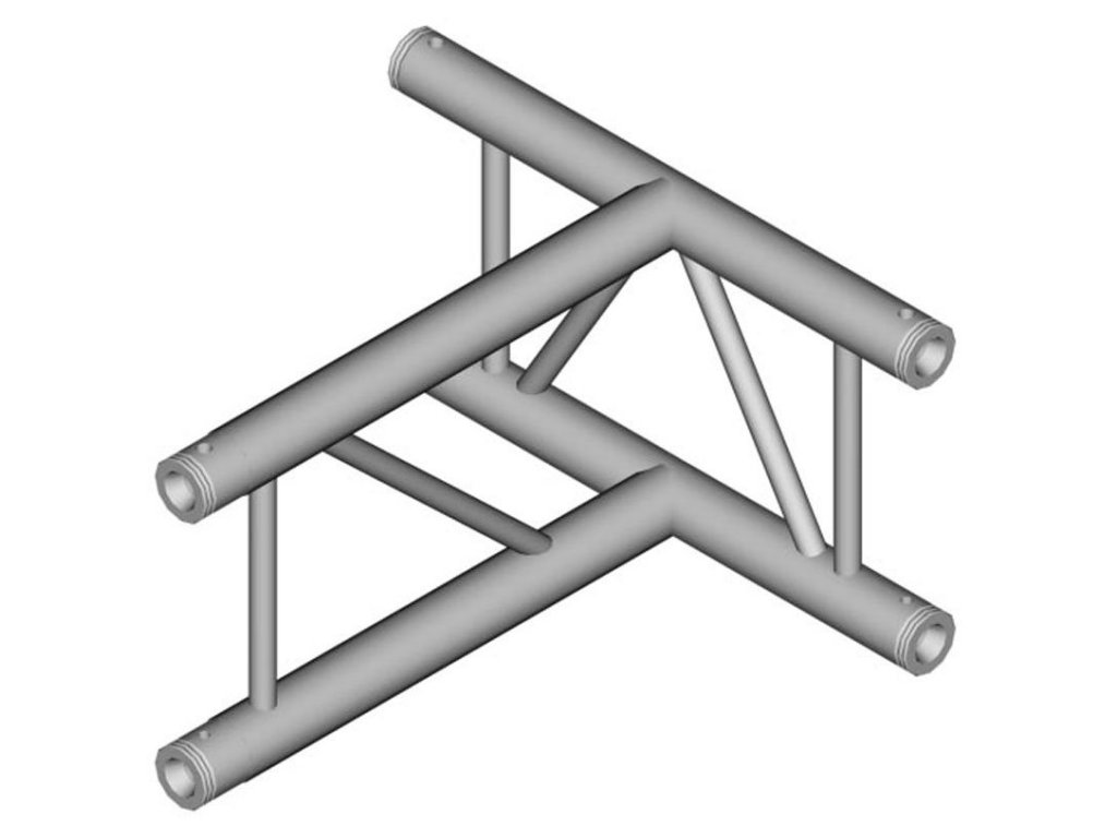 Narożny element konstrukcyjny do budowy słupów i podiów oraz do zawieszania instalacji oświetleniowych lub dźwiękowych. Element serii DT 32-2 składa się z dwóch łączących się prętów ustawionych w 3 kierunkach. Pręty mają średnicę 50 mm i grubość ścianek 2 mm. Pręty podtrzymujące mają średnicę 20 mm i grubość ścianek 2 mm. Konstrukcja wykonana jest ze stopu AlMgSi1, dzięki czemu każdy z elementów serii DT 32-2 zachowuje niską wagę i wysoką wytrzymałość. Element jest wyposażony w końcówki do zasilania kolejnych elementów. Kąt nachylenia: 90° w pionie. Wymiary: 500 x 500 x 290 mm, waga: 3,2 kg.