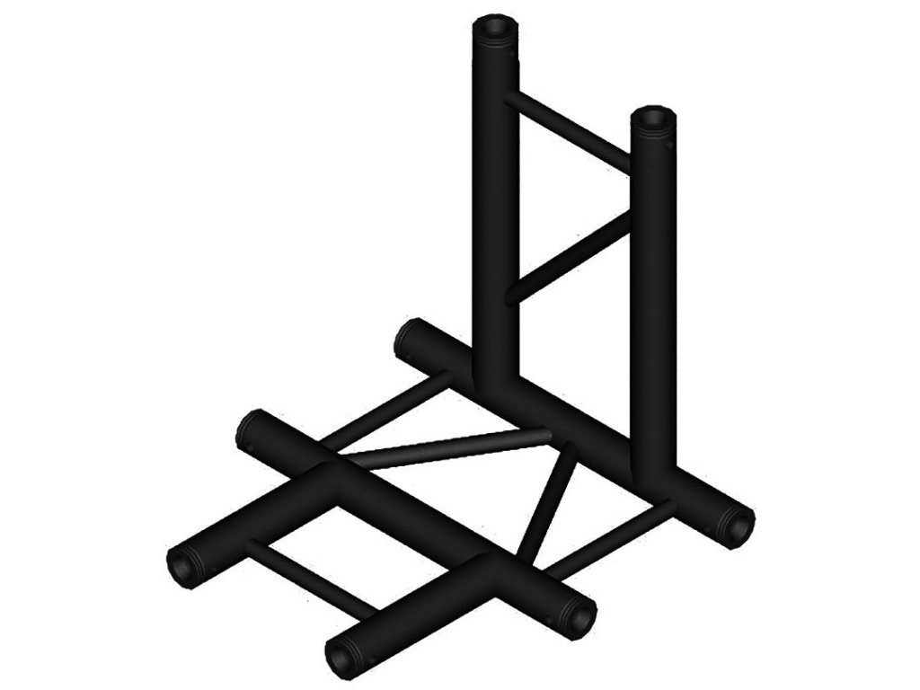 Narożny element konstrukcyjny do budowy słupów i podiów oraz do zawieszania instalacji oświetleniowych lub dźwiękowych. Element z serii DT 32-2 składa się z dwóch łączących się prętów ustawionych w 4 kierunkach w kształt litery T. Pręty mają średnicę 50 mm i grubość ścianek 2 mm. Pręty podtrzymujące mają średnicę 20 mm i grubość ścianek 2 mm. Konstrukcja wykonana jest ze stopu AlMgSi1, dzięki czemu każdy z elementów serii DT 32-2 zachowuje niską wagę i wysoką wytrzymałość. Element jest wyposażony w końcówki do zasilania kolejnych elementów. Kąt nachylenia: 90° w poziomie. Wymiary: 500 x 500 x 500 mm, waga: 4,4 kg. Kolor czarny.