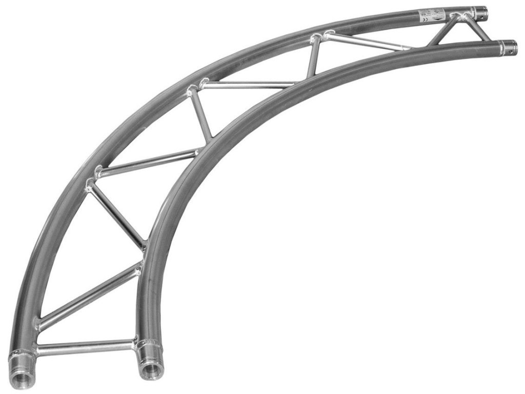 Element konstrukcyjny do budowy słupów i podiów oraz do zawieszania instalacji oświetleniowych lub dźwiękowych. Element z serii DT 32-2 składa się z dwóch łączących, zaokrąglonych prętów i jest przeznaczony do budowy zaokrąglonych narożników lub okrągłych konstrukcji. Pręty mają średnicę 50 mm i grubość ścianek 2 mm. Pręty podtrzymujące mają średnicę 20 mm i grubość ścianek 2 mm. Konstrukcja wykonana jest ze stopu AlMgSi1, dzięki czemu każdy z elementów serii DT 32-2 zachowuje niską wagę i wysoką wytrzymałość. Element jest wyposażony w końcówki do zasilania kolejnych elementów. Kąt nachylenia: 90° w poziomie. Wymiary: 3142 x 50 x 290 mm, waga: 6,4 kg.