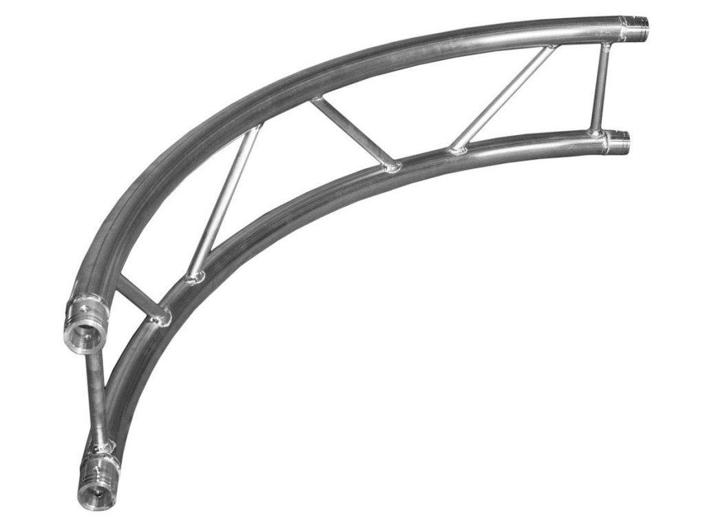 Element konstrukcyjny do budowy słupów i podiów oraz do zawieszania instalacji oświetleniowych lub dźwiękowych. Element z serii DT 32-2 składa się z dwóch łączących, zaokrąglonych prętów i jest przeznaczony do budowy zaokrąglonych narożników lub okrągłych konstrukcji. Pręty mają średnicę 50 mm i grubość ścianek 2 mm. Pręty podtrzymujące mają średnicę 20 mm i grubość ścianek 2 mm. Konstrukcja wykonana jest ze stopu AlMgSi1, dzięki czemu każdy z elementów serii DT 32-2 zachowuje niską wagę i wysoką wytrzymałość. Element jest wyposażony w końcówki do zasilania kolejnych elementów. Kąt nachylenia: 45° w pionie. Wymiary: 2356 x 50 x 290 mm, waga: 5,05 kg.