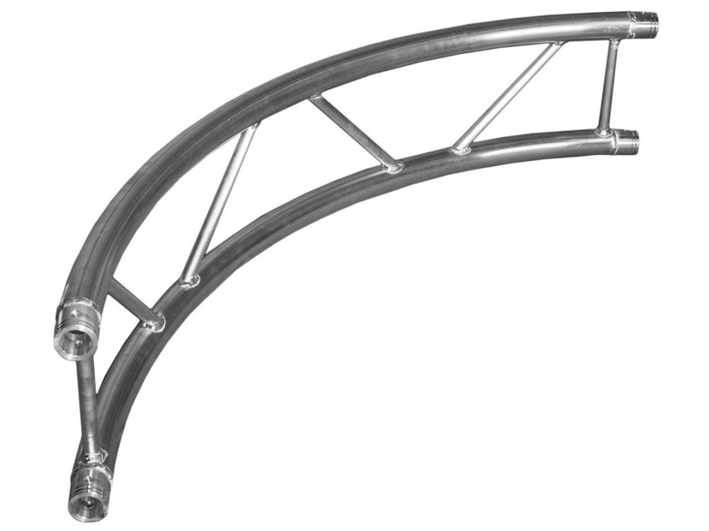Element konstrukcyjny do budowy słupów i podiów oraz do zawieszania instalacji oświetleniowych lub dźwiękowych. Element z serii DT 32-2 składa się z dwóch łączących, zaokrąglonych prętów i jest przeznaczony do budowy zaokrąglonych narożników lub okrągłych konstrukcji. Pręty mają średnicę 50 mm i grubość ścianek 2 mm. Pręty podtrzymujące mają średnicę 20 mm i grubość ścianek 2 mm. Konstrukcja wykonana jest ze stopu AlMgSi1, dzięki czemu każdy z elementów serii DT 32-2 zachowuje niską wagę i wysoką wytrzymałość. Element jest wyposażony w końcówki do zasilania kolejnych elementów. Kąt nachylenia: 45° w pionie. Wymiary: 3142 x 50 x 290 mm, waga: 6,6 kg.