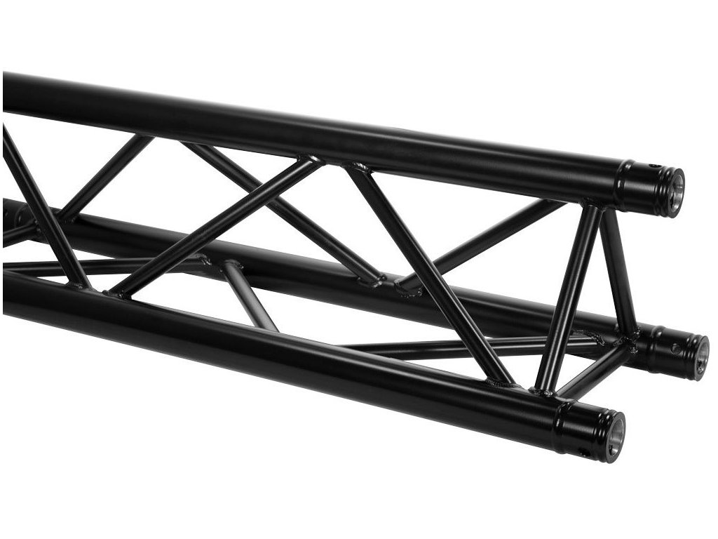 Słup konstrukcyjny do budowy instalacji oświetleniowych lub dźwiękowych. Słup ma długość 100 cm i jest wykonany z trzech rur o średnicy 50 mm i ściankach o grubości 2 mm. Konstrukcja wykonana jest z aluminium, dzięki czemu słup zachowuje niską wagę. Tyče wzmacniające mają średnicę 20 mm i grubość ścianki 2 mm. Słup jest zakończony adapterami do zasilania kolejnych elementów. W zestawie znajdują się również śruby i klamry zabezpieczające. Długość: 2000 mm (bez stożka), szerokość: 290 mm, wysokość: 257 mm, a waga: 8,1 kg. Kolor czarny.