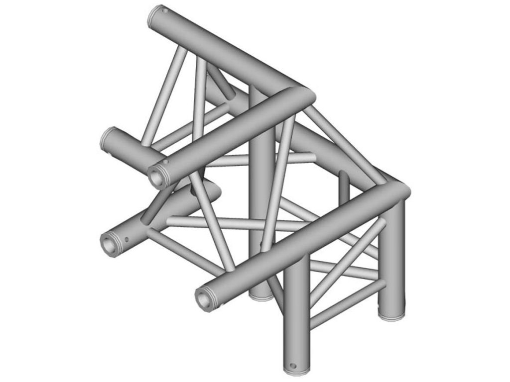 Aluminiowy trójdrożny element narożny 90° skierowany w dół.