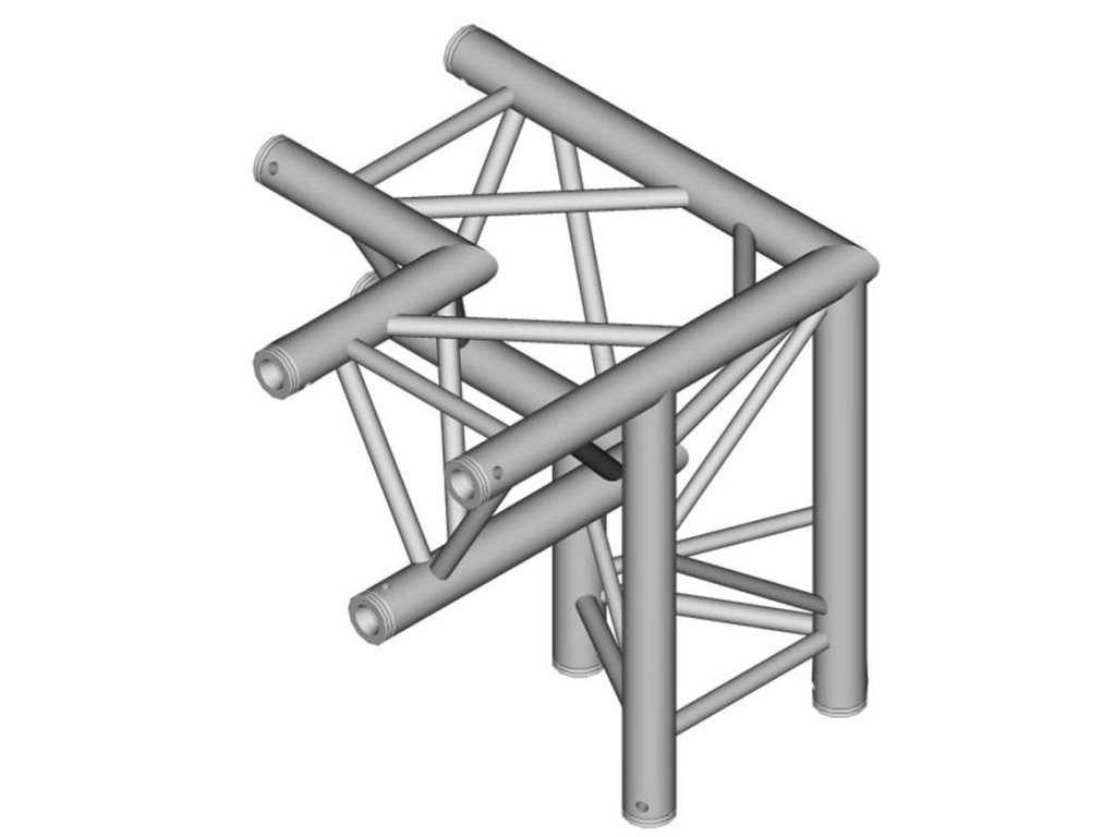 Aluminiowy trójdrożny element narożny 90° skierowany w dół.