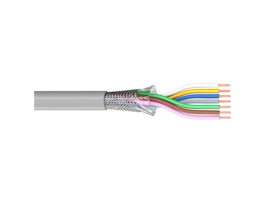 Elastyczny, ale wytrzymały kabel sterowniczy 7 x 0,34 mm LIY-CY z miedzi OFC. Kabel służy jako przewód sygnałowy w zakresie miliamperów dla urządzeń sterujących, takich jak RS232 lub RS422. Całkowita średnica kabla 6,3 mm, ekranowanie 90%, kolor szary, klasa CRP Eca. Specjalne PVC jest niepalne i samogasnące zgodnie z VDE 0472 i częścią 804 oraz przeszło test FRNC typu B (zgodnie z DIN EN 60332-1-1 / IEC 60332-1).