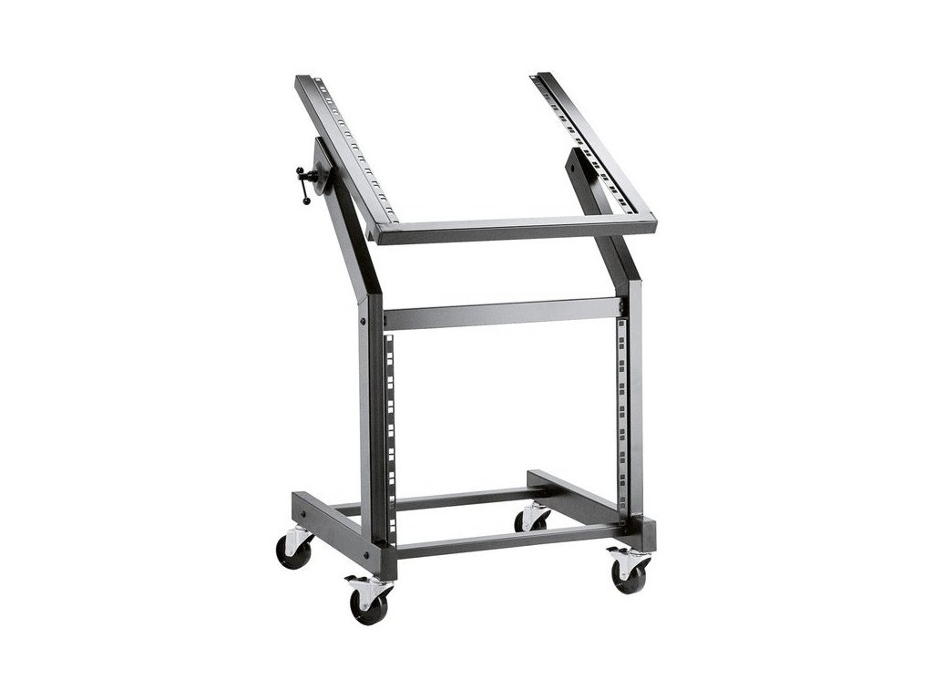 Mobilna szafa rack 19". Stalowa, bardzo mocna konstrukcja, 4 kółka, w tym 2 z możliwością blokady. W górnej części znajduje się miejsce na 12 jednostek, w dolnej części na 9 jednostek. Kąt regulacji do 45°. Nośność 50 kg. Wysokość 875 mm. W zestawie znajduje się 32 szt. śrub M5 x 16 i nakrętek M5. Stojak produkowany jest w kolorze czarnym.