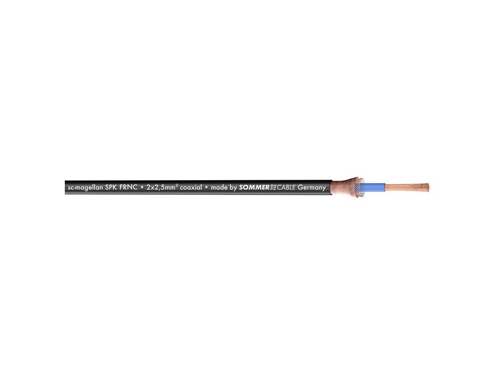 Koaksjalny kabel głośnikowy Magelan SPK 225 425-0201F, o przekrojach 2 x 2,25 mm2 (AWG13), 100 % ekranowania, zakres temperatur użytkowania -25° C do +70° C, waga 1 m 73 g, pojemność na 1 m 150 pF, średnica kabla 6 mm, kolor czarny, miedź OFC. Zastosowanie do instalacji stałych. FRNC niepalna i bezhalogenowa wersja LSZH, klasa Fca.