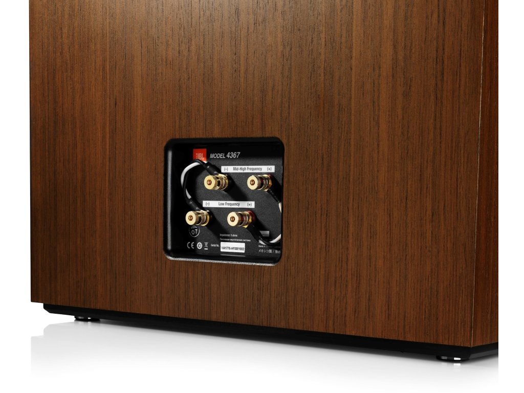 Obudowa głośnika ma ścianki z MDF o grubości 25 mm, które w przedniej części pod falowodem tubowym są jeszcze wzmocnione drugą powierzchnią obudowy o grubości 6 mm. Ta masywna ściana o grubości 40 mm jest zatem doskonałym wsparciem mocującym dla głośnika basowego. Sztywność obudowy jest dodatkowo zwiększona dzięki zastosowaniu dwóch oddzielnych, pełnoobwodowych, poziomych wzmocnień. Dwa przednie, optymalnie dostrojone porty bass-reflex w dolnej części ułatwiają wybór umiejscowienia i zmniejszają wpływ dźwięku, jeśli głośnik znajduje się w pobliżu tylnej ściany. 4367 są oferowane z wykończeniem z naturalnego drewna orzechowego. Alternatywnie fornir orzechowy może mieć czarne matowe wykończenie. Część obudowy pokryta przednią maskownicą ma subtelny niebieski kolor, który jest typowy dla monitorów studyjnych JBL z ostatnich czasów.