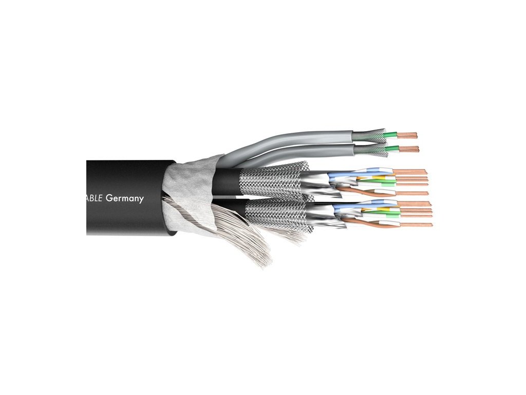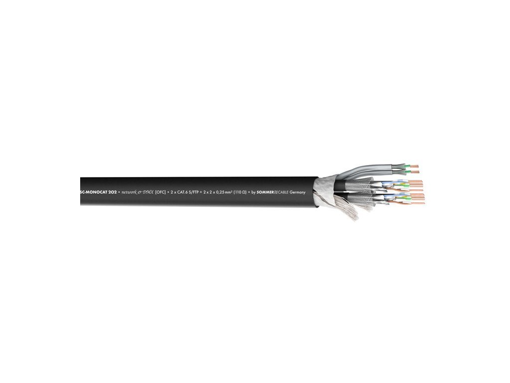 MONOCAT POWER 202 PVC z zintegrowanym kablem danych 2 x CAT.7, kablem 2 x DMX. Kabel nadaje się do zastosowań mobilnych i instalacyjnych. Wewnętrzna struktura Cat.7 2 x 4 x 2 x 0,14 mm ze spiralnym ekranowaniem z miedzi ocynowanej + folia AL/PT, wewnętrzna struktura DMX 2 x 2 x 0,25 mm 110 Ohm ze spiralnym ekranowaniem z miedzi ocynowanej. Ekranowanie całkowite 100 %, maksymalna długość jednego przewodu wynosi 100 m, zakres temperatur użytkowania -20° C do +75° C, zastosowano wysokiej jakości miedź OFC. Przewody są umieszczone w powłoce PVC o średnicy całkowitej 15,6 mm, waga 1 m 350 g, kolor czarny.