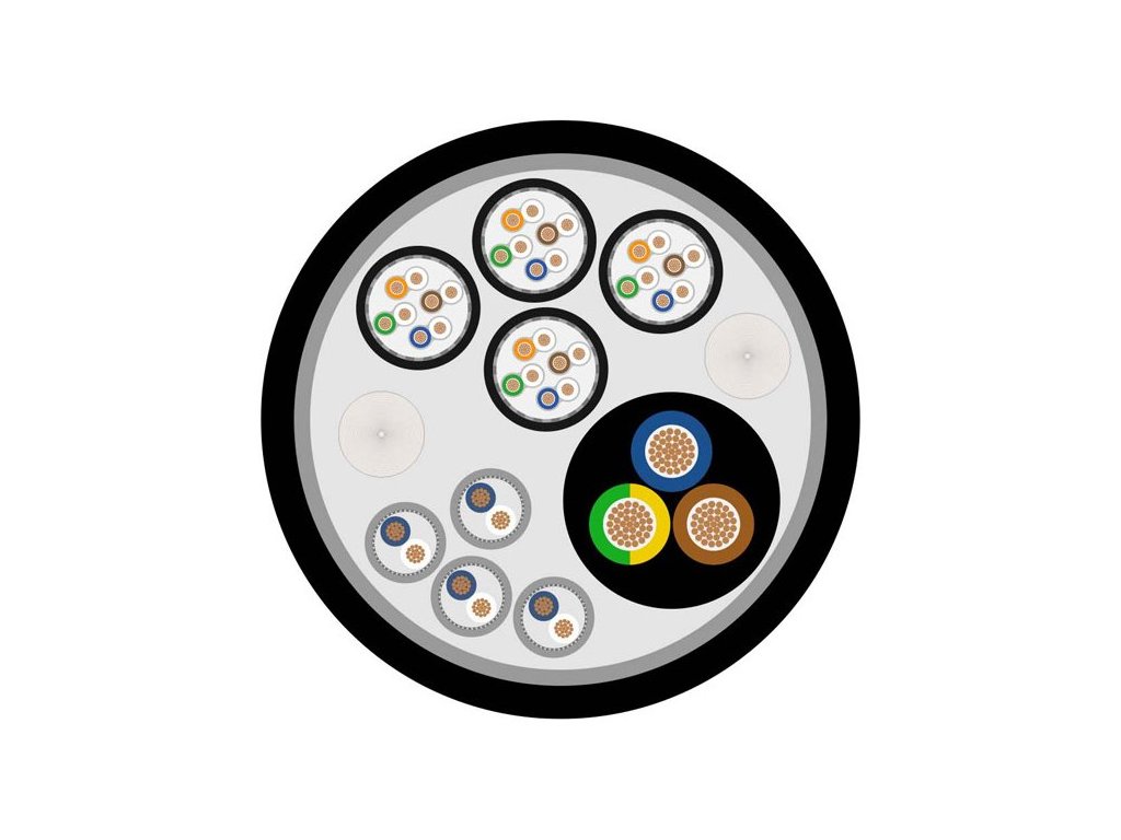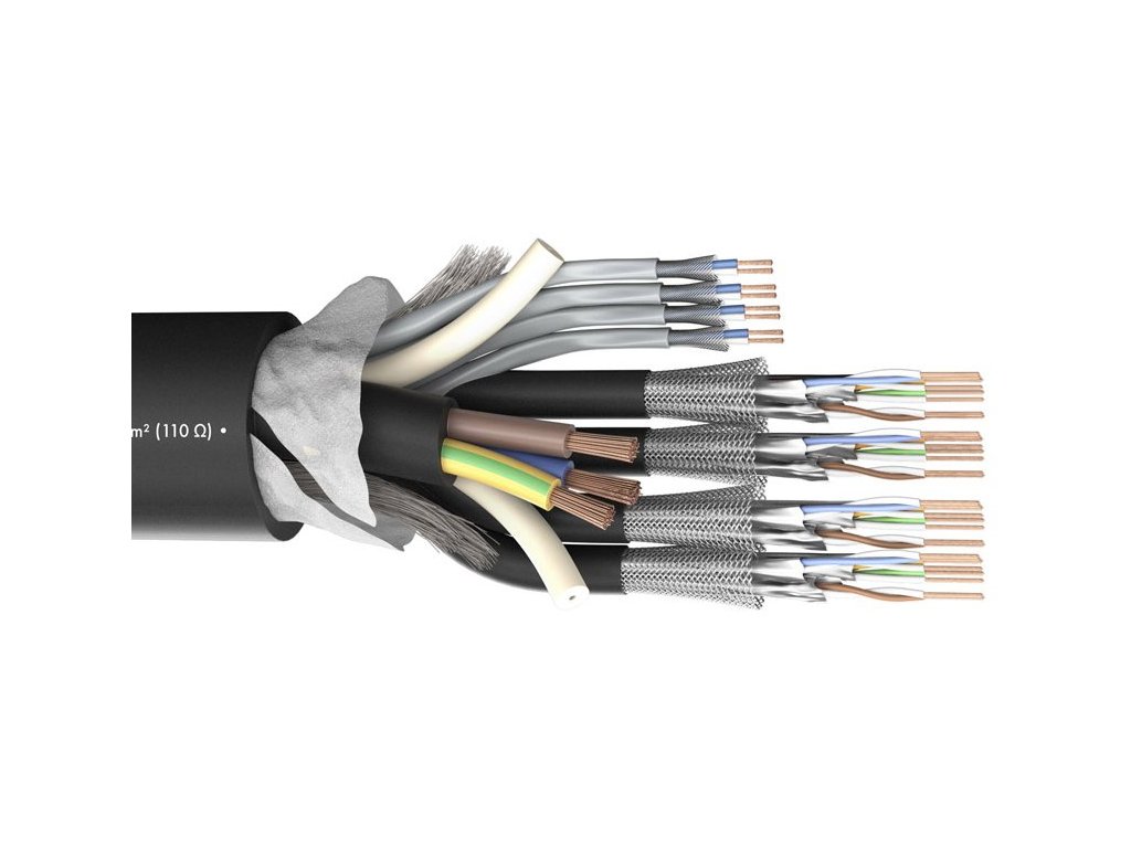 MONOCAT POWER 414 PVC z zintegrowanym kablem danych 4 x CAT.6, kablem 4 x DMX i kablem zasilającym 1 x 3 x 2,5 mm. Kabel nadaje się do zastosowań mobilnych i instalacyjnych. Wewnętrzna struktura Cat.6 4 x 4 x 2 x 0,14 mm ze spiralnym ekranowaniem z miedzi ocynowanej + folia AL/PT, wewnętrzna struktura DMX 4 x 2 x 0,25 mm 110 Ohm ze spiralnym ekranowaniem z miedzi ocynowanej, wewnętrzna struktura POWER 3 x 2,5 mm z cienkich drucików miedzianych. Ekranowanie całkowite 100 %, maksymalna długość jednego przewodu wynosi 100 m, zakres temperatur pracy -20° C do +75° C, zastosowano wysokiej jakości miedź OFC, przewody są umieszczone w powłoce PVC o średnicy całkowitej 27 mm, waga 1 m 740 g, kolor czarny.