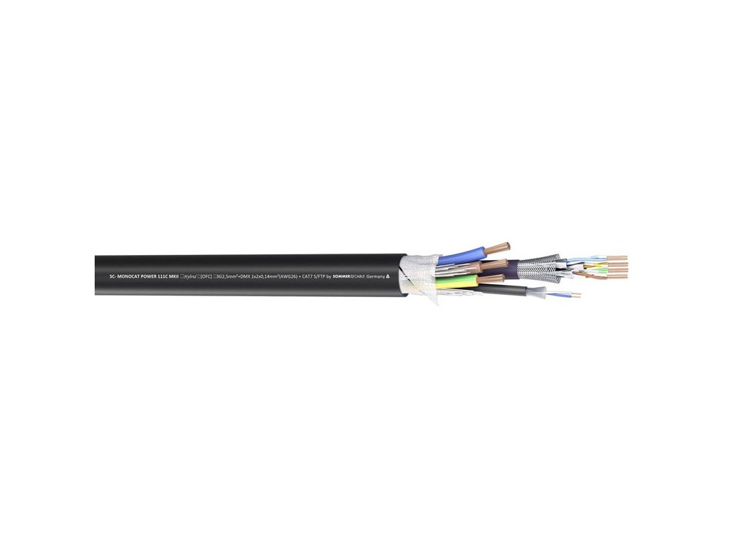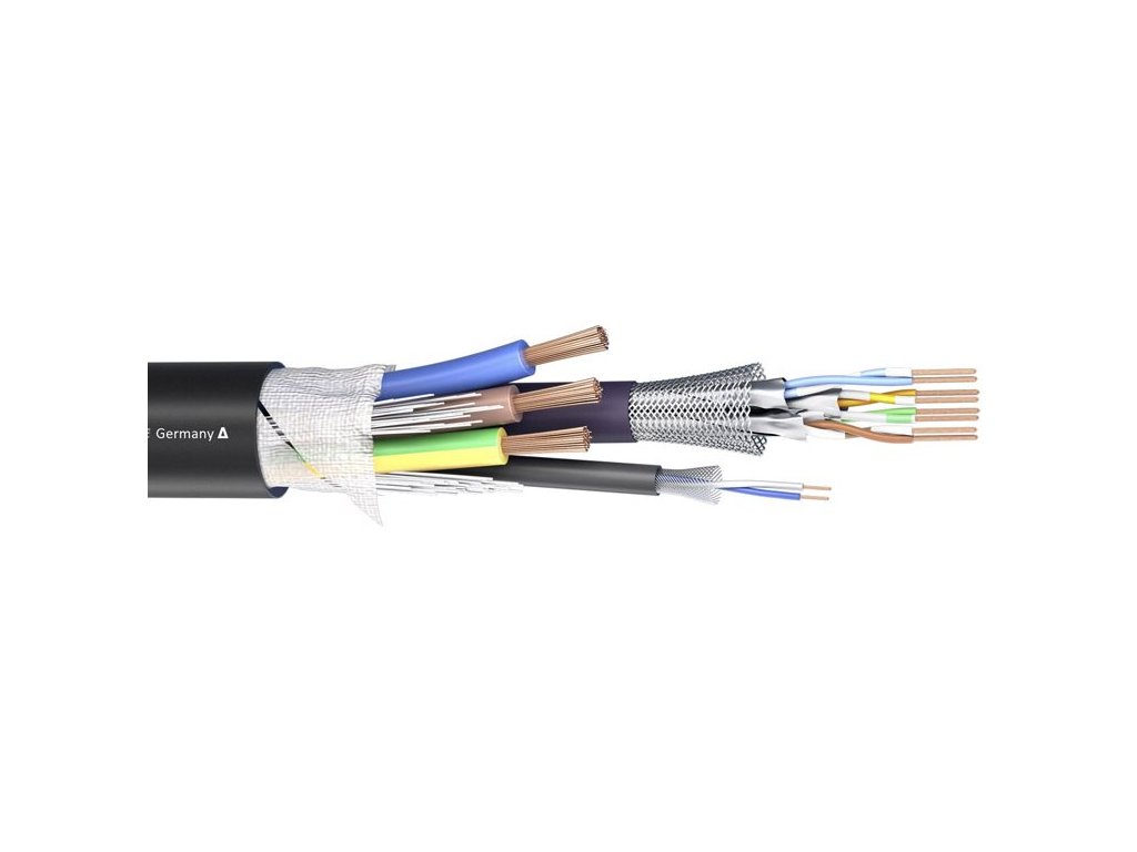 Kabel hybrydowy składający się z 1 x 3 x 2,5 mm + 1 x LAN CAT.7 + 1 x AES/EBU, DMX 2 x 0,14 mm. Kabel nadaje się do zastosowań mobilnych. Całość umieszczona jest w elastycznej powłoce PVC o średnicy 14,5 mm, odpornej na promieniowanie UV. Całkowita waga 260 g / 1 m. Klasa CPR: Fca.