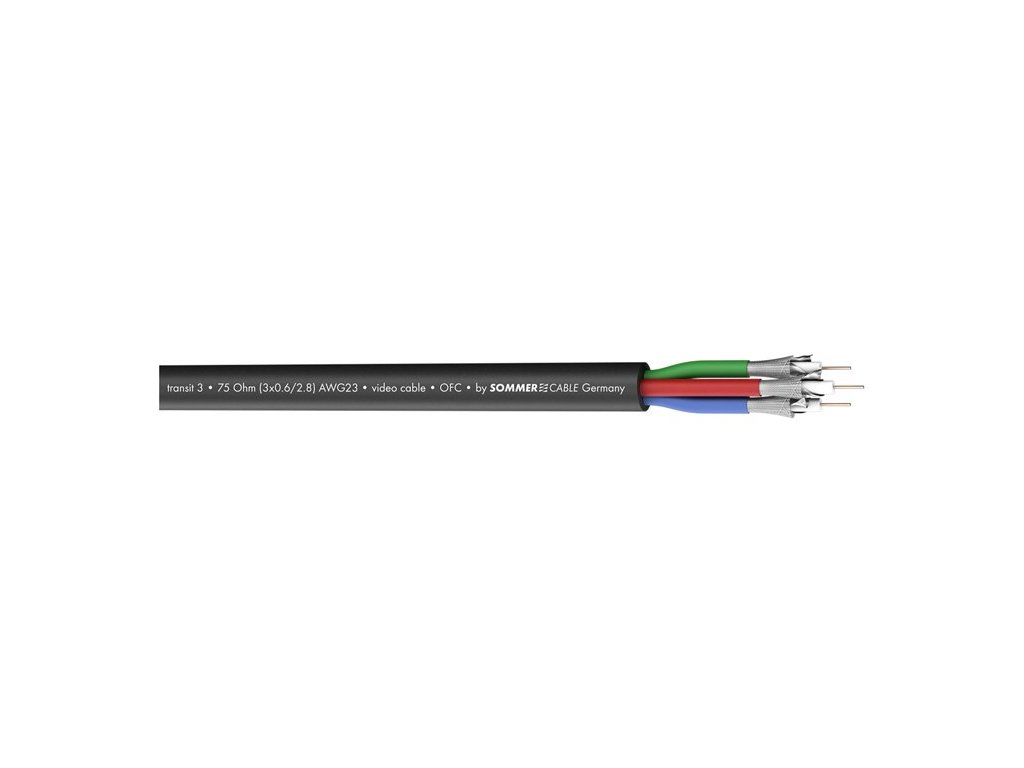 Kabel wideo wieloparowy 75 Ohm TRANSIT 3, 3 x kabel wideo o przekroju żyły przewodzącej 0,60 mm. Przekrój PVC 11,2 mm, masa 1 m 150 g, pojemność na 1 m 55 pF, ekranowanie 100 %. Kabel nadaje się do przesyłania sygnału SDI-180 m, HD-SDI-150 m, 3G-60 m. Zastosowanie w aplikacjach mobilnych i instalacyjnych. Zalecane złącza: BNC NBNC75BFG7.