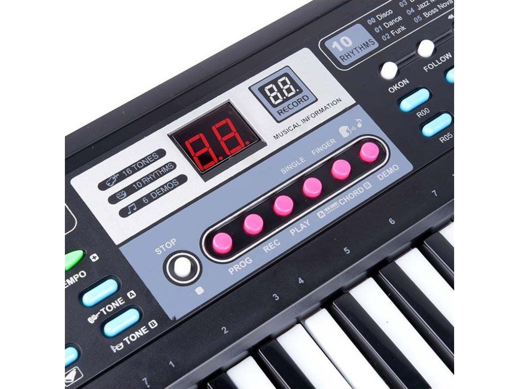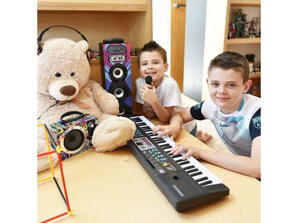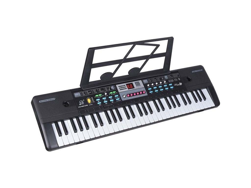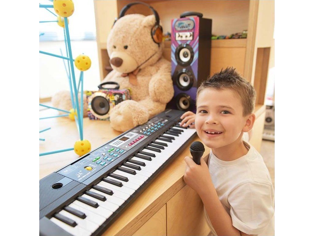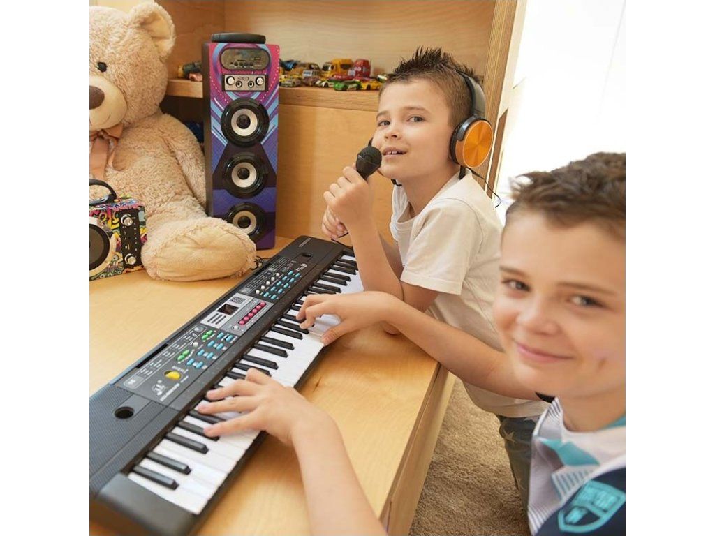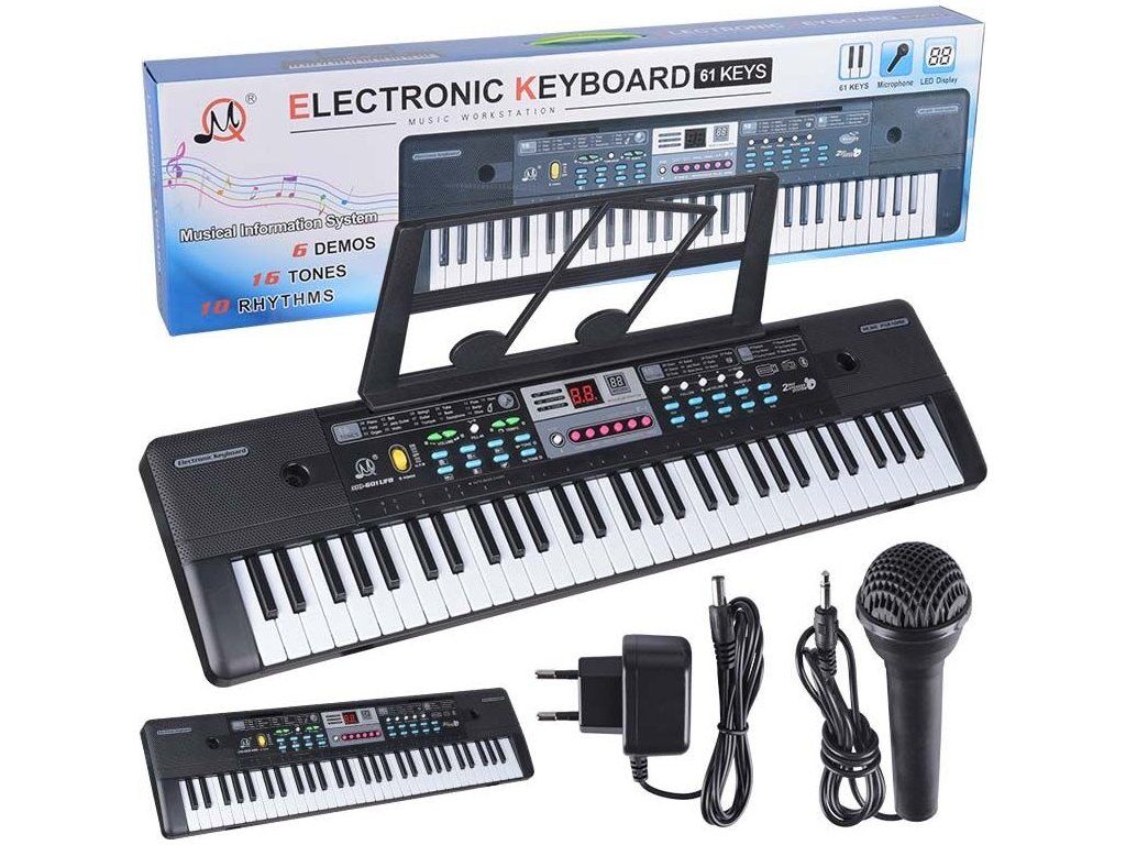 MQ 601 Keyboard to keyboard z mikrofonem dla dzieci, który oferuje wiele ciekawych funkcji, stanowiąc doskonałe narzędzie do zabawy i nauki gry na pianinie. Urządzenie posiada 61 klawiszy, co daje łączny zakres 5 oktaw. W dwóch bankach pamięci wewnętrznej znajduje się 16 zróżnicowanych brzmień i 10 podkładów rytmicznych, dzięki którym najmłodsi mogą poznawać świat instrumentów i popularnych stylów muzycznych. Urozmaiceniem są dodatkowe dźwięki perkusyjne i ciekawie brzmiące efekty.