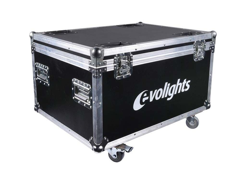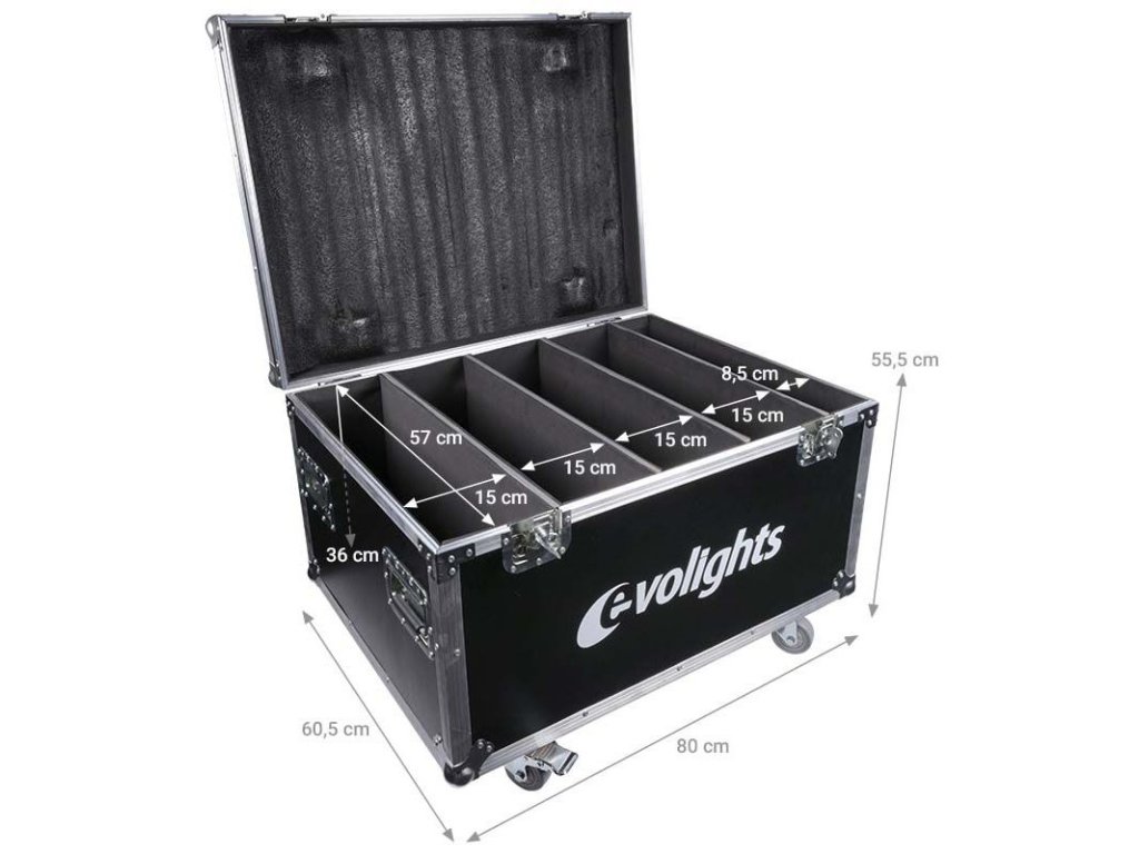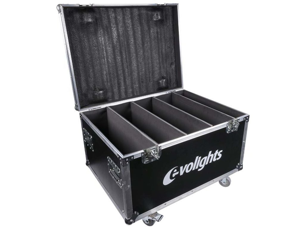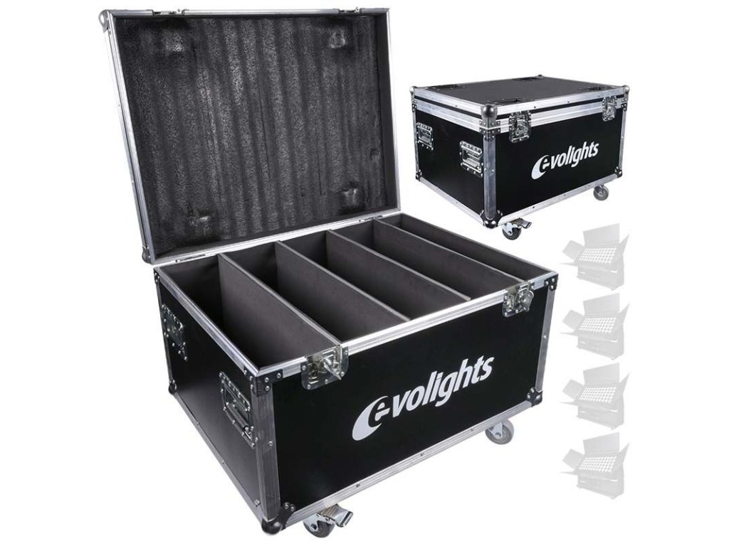 Profesjonalny i bardzo wytrzymały kufer transportowy na 4 reflektory Evolights 60x10W RGBW LED Wall Washer IP65 lub inne urządzenia o podobnych wymiarach. Kufer wykonany jest z 7mm grubej sklejki pomalowanej specjalną wodoodporną farbą. Jego krawędzie są wzmocnione aluminiowymi profilami. Na rogach znajdują się chromowane, kulowe osłony, które dodatkowo chronią kufer i otoczenie, eliminując ostre krawędzie. Pokrywa jest zabezpieczona przed przypadkowym otwarciem dwoma masywnymi zamkami motylkowymi. Otwiera się z jednej strony do pozycji pionowej, a odpowiedni kąt nachylenia zapobiega samoczynnemu opadnięciu i zapewnia łatwy i wygodny dostęp do przechowywanych urządzeń. Wewnątrz znajdują się 4 komory idealnie dopasowane do świateł oraz dodatkowa przegroda na okablowanie i różne akcesoria. Wnętrze kufra wyściełane jest miękką pianką techniczną, która doskonale chroni przechowywane wyposażenie przed uszkodzeniem. Po bokach kufra znajdują się wygodne uchwyty do przenoszenia, a na spodzie cztery kółka (2 z hamulcem).