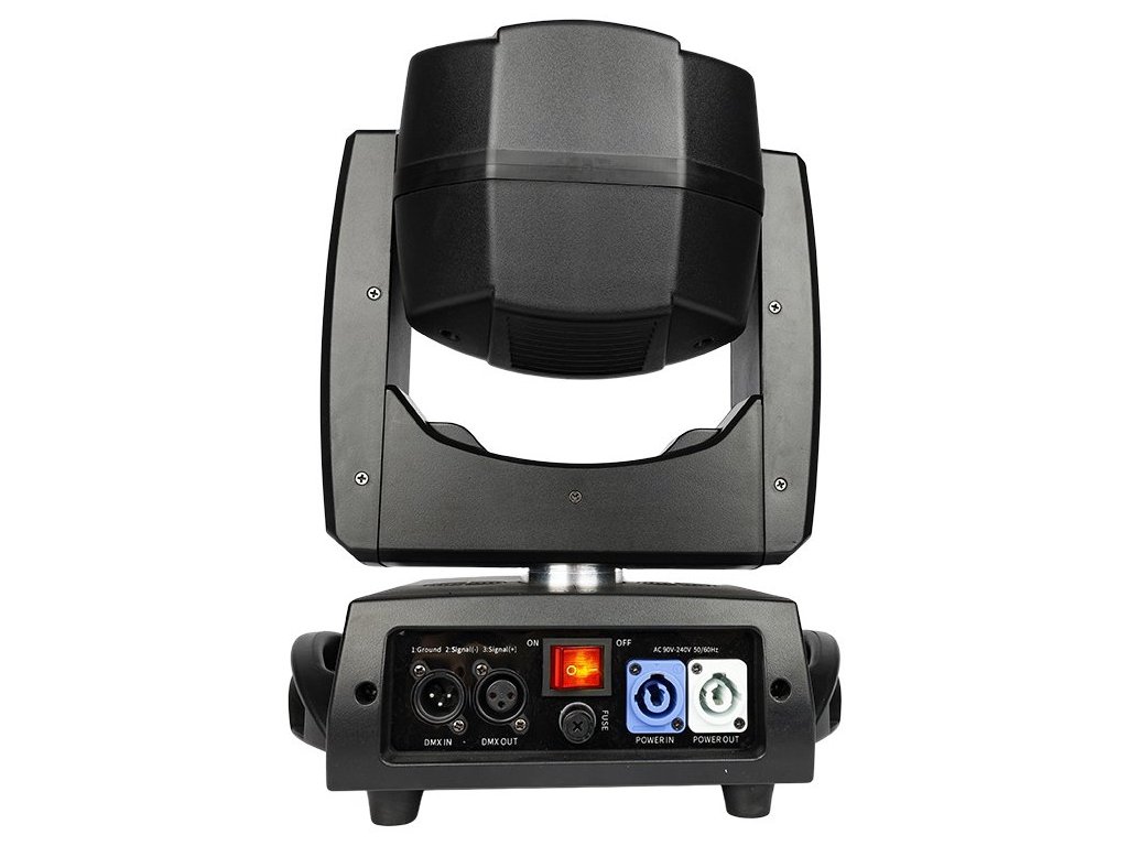 Z tyłu głowicy Light4Me 7R Smart Beam znajdują się 3-pinowe złącza DMX i złącza zasilania PowerCon. Z przodu znajduje się praktyczny panel sterowania z dużym wyświetlaczem LCD i czterema przyciskami. Za ich pomocą możemy zmieniać ustawienia w menu lub wybrać jeden z czterech trybów pracy: