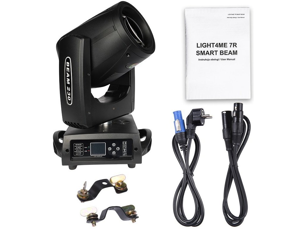 - W zestawie: Głowica 7R Smart Beam 230W, kabel zasilający, kabel DMX, uchwyty montażowe, krótka instrukcja obsługi