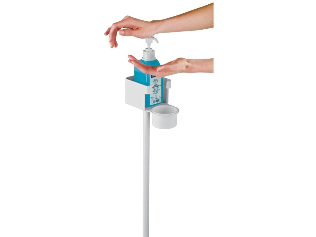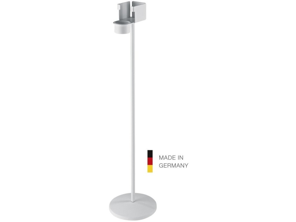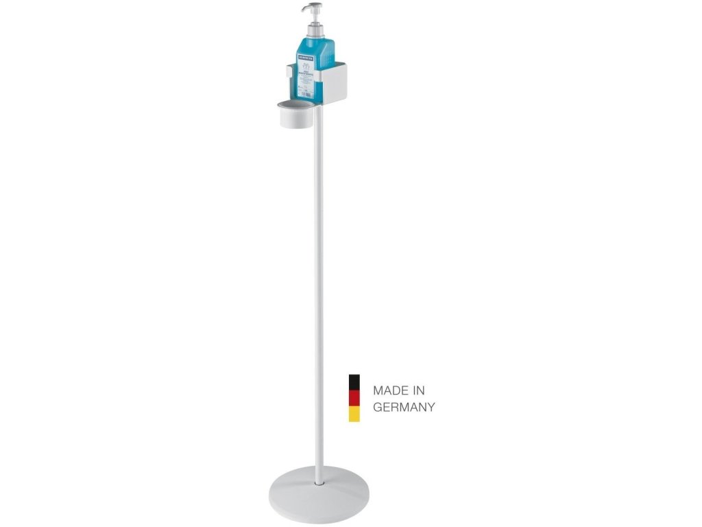 Stojak na dezynfekcję. Stalowy stojak ma okrągłą podstawę o średnicy 250 mm od spodu wyposażoną w ochronną gumową podkładkę. Wysokość 1020 mm. Wymiary uchwytu na pojemnik 102 x 91 mm. Plastikowy ociekacz można zdjąć i łatwo wyczyścić. Informujemy, że stojak nie jest produktem certyfikowanym medycznie. Środek dezynfekujący nie jest częścią dostawy. Produkowany jest w kolorze białym.