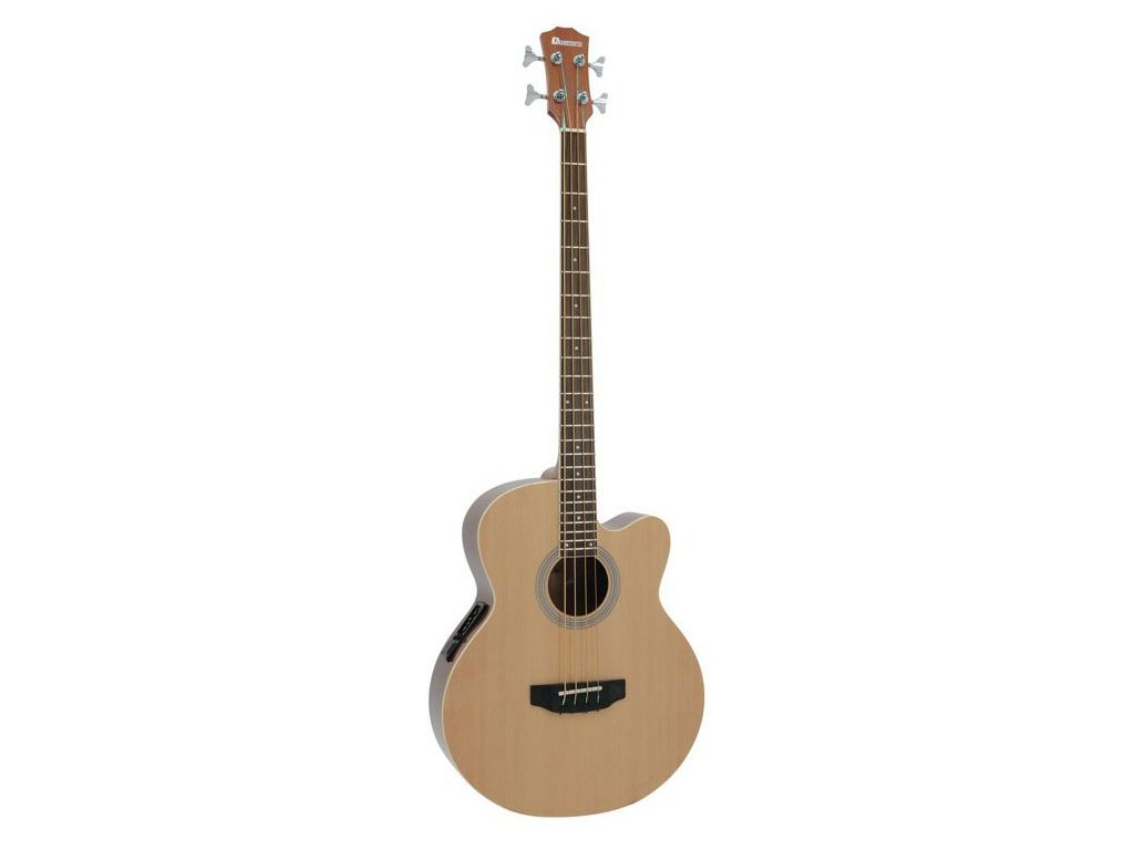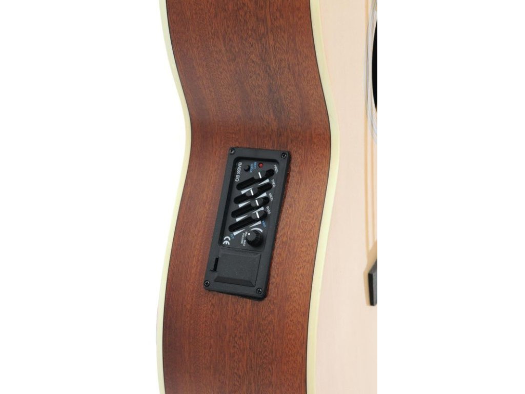 Gitara basowa elektroakustyczna. Top świerkowy, korpus z agatis, Cutaway, gryf nato, podstrunnica palisandrowa, menzura 864 mm, mostek palisandrowy, chromowany osprzęt, przedwzmacniacz z 3-pasmowym equalizerem i regulacją Present. Sterowanie za pomocą potencjometru obrotowego.