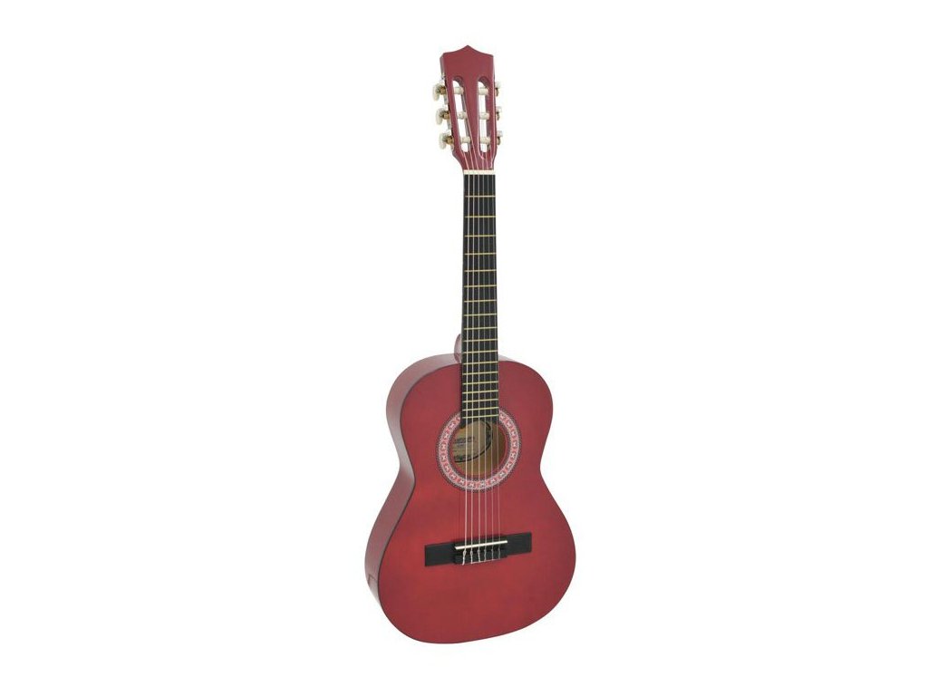 Gitara klasyczna 1/2. Płyta wierzchnia, płyta spodnia i boki akacjowe, gryf klonowy, podstrunnica z bejcowanej sklejki, mostek z bejcowanego klonu. Kolor czerwony.