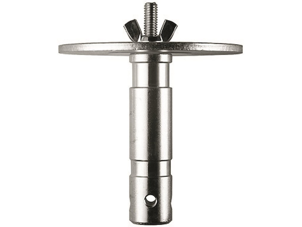 Adapter 28 mm (męski), górny adapter 1 trzpień 1/8'' (28 mm), obrotowy adapter M10 z płytką 12 cm, wysokość 14,5 cm, wykonany ze stali cynkowej.