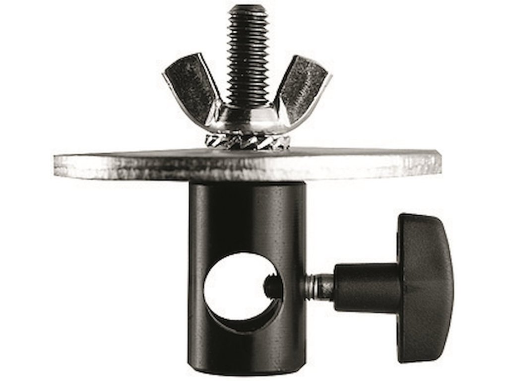 Adapter 16 mm (żeński) do statywu, śruba 3/8'' (9,5 mm), tarcza 3,2'' (80 mm), nakrętka motylkowa, odpowiednie do głowic statywowych, wsparcie adaptera 5/8" ze śrubą 3/8''.