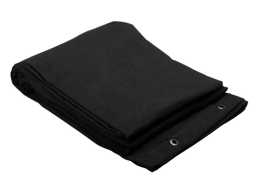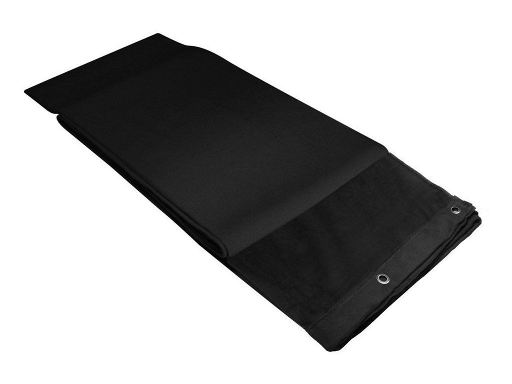 Czarny molton dekoracyjny impregnowany substancją trudnopalną o gramaturze 160 g jako zasłona, tło lub do celów dekoracyjnych. Tkaniny posiadają przelotki rozmieszczone co 25 cm wzdłuż jednego boku, są podłożone dodatkowym pasem taśmy, co umożliwia szybki i bezpieczny montaż zarówno mocno naciągnięte, jak i luźno plisowane. Przelotki posiadają nierdzewne polerowane okucie i średnicę otworu 12 milimetrów. Zewnętrzne krawędzie są obszyte, a dolna krawędź jest bez obszycia, dzięki czemu materiał można łatwo i szybko skrócić do wymaganej długości.