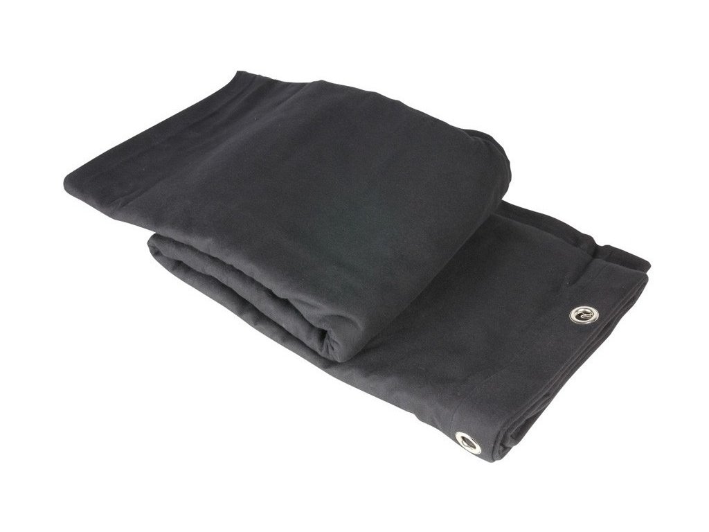 Nieprzewiewna czarna tkanina zaciemniająca z impregnacją opóźniającą palenie (B1 zgodnie z DIN 4102) i gramaturze 300 g, jako zasłona, tło lub do celów dekoracyjnych. Tkaniny posiadają po jednej stronie przelotki rozmieszczone co 25 cm i są podłożone dodatkowym pasem taśmy, co umożliwia szybki i bezpieczny montaż zarówno w postaci mocno napiętej, jak i luźno układanej. Oczka są nierdzewne, polerowane i mają średnicę otworu 12 milimetrów. Zewnętrzne krawędzie są obszyte, a dolna krawędź jest bez obszycia, dzięki czemu materiał można łatwo i szybko skrócić do wymaganej długości. Oczka znajdują się po szerszej stronie.
