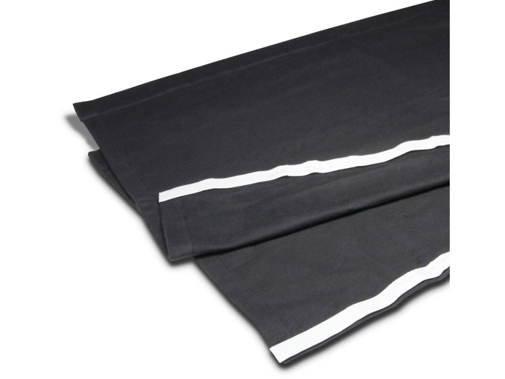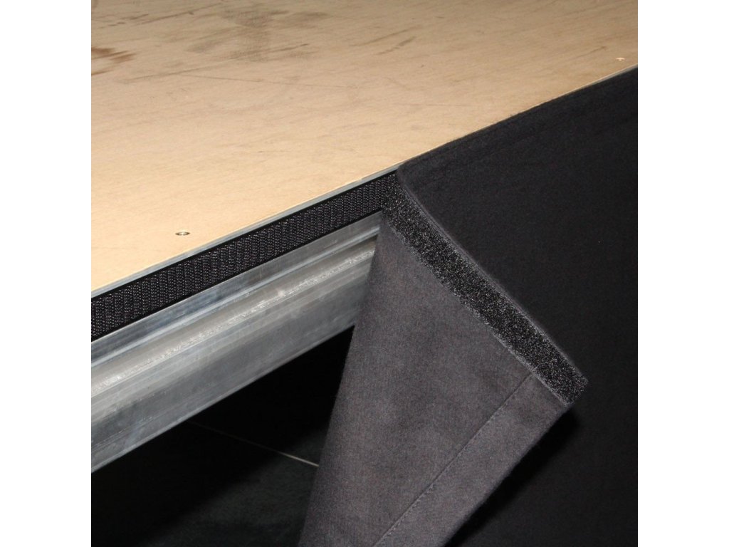 Nieprzewiewna czarna tkanina zaciemniająca impregnowana środkiem zmniejszającym palność (B1 zgodnie z DIN 4102) o gramaturze 300 g. Tkaniny posiadają samoprzylepny pasek z haczykiem i pętelką, dzięki któremu można je łatwo przymocować do podestów itp. i w każdej chwili odpiąć.