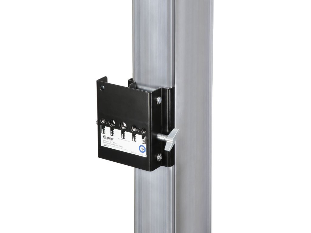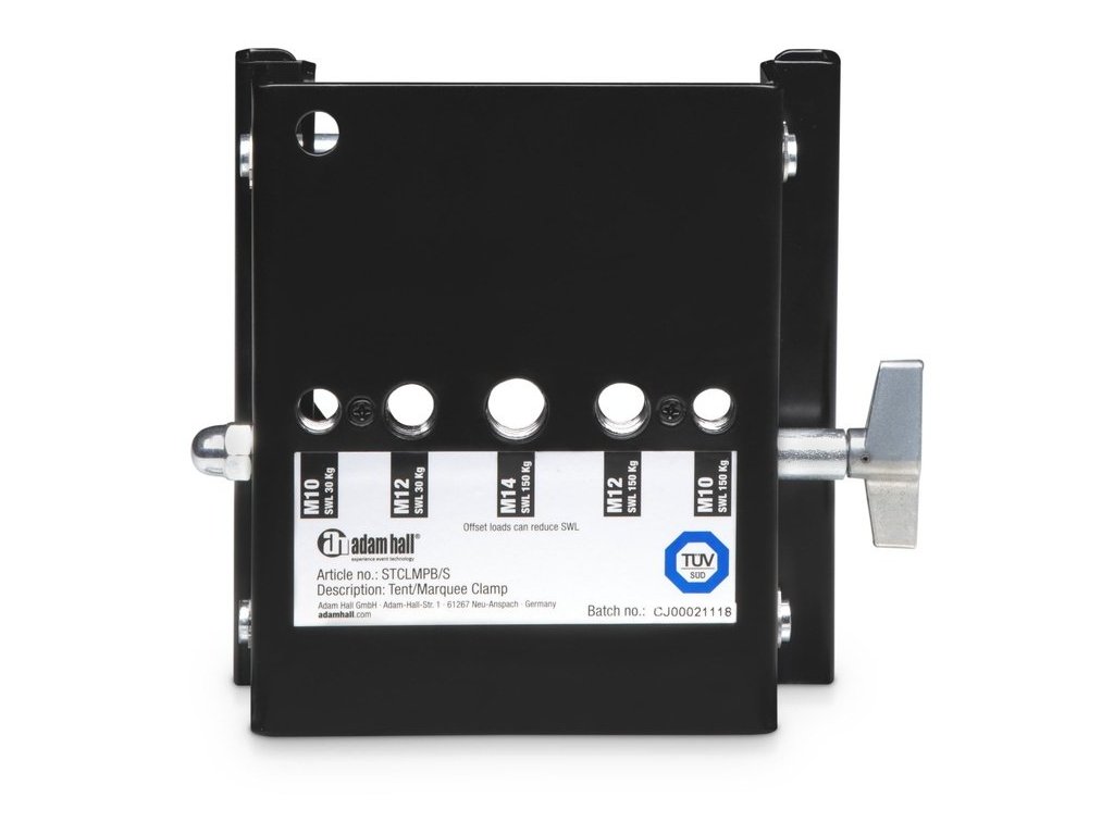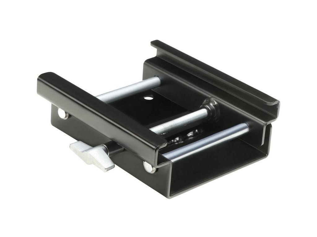 Za pomocą tego regulowanego zacisku do rusztowań można łatwo tworzyć punkty zawieszenia dla urządzeń audio i oświetleniowych. Nadaje się do belek o szerokości od 50 do 100 mm i udźwigu do 150 kg. Zacisk jest wyposażony w pięć wbudowanych punktów mocowania dla śrub z oczkiem i innego osprzętu mocującego.